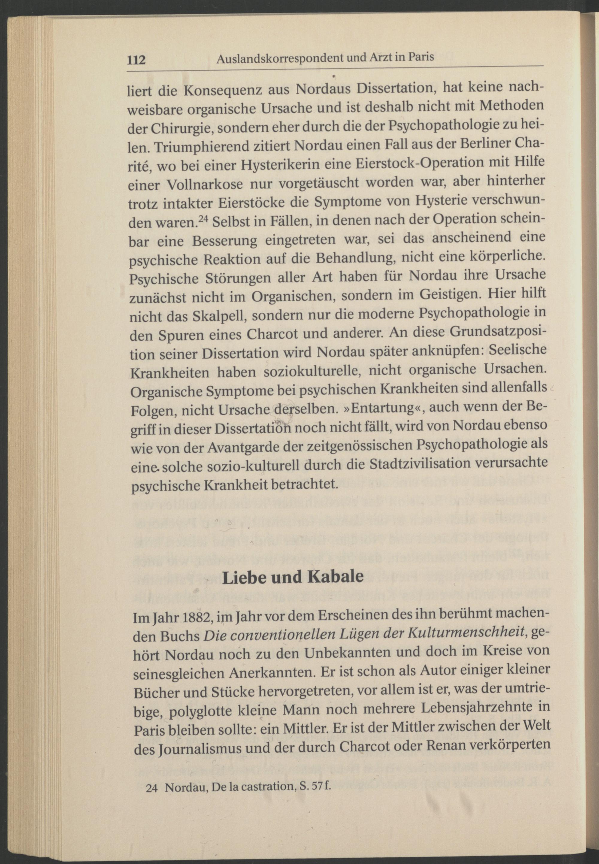 liert die Konsequenz aus Nordaus Dissertation, hat keine nachweisbare organische Ursache und ist deshalb nicht mit Methoden der Chirurgie, sondern eher durch die der Psychopathologie zu heilen. Triumphierend zitiert Nordau einen Fall aus der Berliner Charite, wo bei einer Hysterikerin eine Eierstock-Operation mit Hilfe einer Vollnarkose nur vorgetäuscht worden war, aber hinterher trotz intakter Eierstöcke die Symptome von Hysterie verschwunden waren. 24 Selbst in Fällen, in denen nach der Operation scheinbar eine Besserung eingetreten war, sei das anscheinend eine psychische Reaktion auf die Behandlung, nicht eine körperliche. Psychische Störungen aller Art haben für Nordau ihre Ursache zunächst nicht im Organischen, sondern im Geistigen. Hier hilft nicht das Skalpell, sondern nur die moderne Psychopathologie in den Spuren eines Charcot und anderer. An diese Grundsatzposition seiner Dissertation wird Nordau später anknüpfen: Seelische Krankheiten haben soziokulturelle, nicht organische Ursachen. Organische Symptome bei psychischen Krankheiten sind allenfalls Folgen, nicht Ursache derselben. »Entartung«, auch wenn der Begriff in dieser Dissertatioh noch nicht fällt, wird von Nordau ebenso wie von der Avantgarde der zeitgenössischen Psychopathologie als eine, solche sozio-kulturell durch die Stadtzivilisation verursachte psychische Krankheit betrachtet.