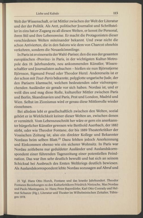 Bei alledem lebt er gesellschaftlich zwischen den Welten, sozial gehört er in Wirklichkeit keiner dieser Welten an, zwischen denen er vermittelt. Vom Lebenszuschnitt her wäre er gern ein anerkannter bürgerlicher Künstler gewesen wie Berthold Auerbach , der 1882 stirbt, oder wie Theodor Fontane , der bis 1889 Theaterkritiker der Vossischen Zeitung ist, also ein direkter Kollege und Bekannter Nordaus beim selben Blatt. 23 Dazu fehlten jedoch Anerkennung und Einkommen ebenso wie ein sicherer Wohnsitz. In Paris war Nordau zeitlebens nur geduldeter Ausländer und Ausländskorrespondent einer führenden Tageszeitung einer potentiellen Feindnation. Das war ihm sehr deutlich bewußt und hat sich an seinem Schicksal bei Ausbruch des Ersten Weltkriegs deutlich bewiesen. Als Ausländskorrespondent lebte Nordau sozusagen auf Abruf und
