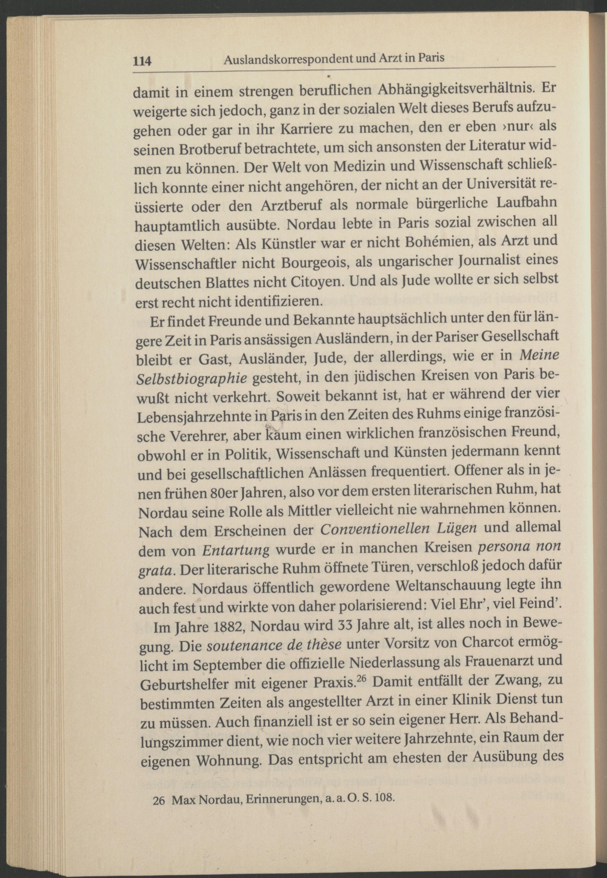 damit in einem strengen beruflichen Abhängigkeitsverhältnis. Er weigerte sich jedoch, ganz in der sozialen Welt dieses Berufs aufzugehen oder gar in ihr Karriere zu machen, den er eben >nur< als seinen Brotberuf betrachtete, um sich ansonsten der Literatur widmen zu können. Der Welt von Medizin und Wissenschaft schließlich konnte einer nicht angehören, der nicht an der Universität reüssierte oder den Arztberuf als normale bürgerliche Laufbahn hauptamtlich ausübte. Nordau lebte in Paris sozial zwischen all diesen Welten: Als Künstler war er nicht Bohemien, als Arzt und Wissenschaftler nicht Bourgeois, als ungarischer Journalist eines deutschen Blattes nicht Citoyen. Und als Jude wollte er sich selbst erst recht nicht identifizieren.