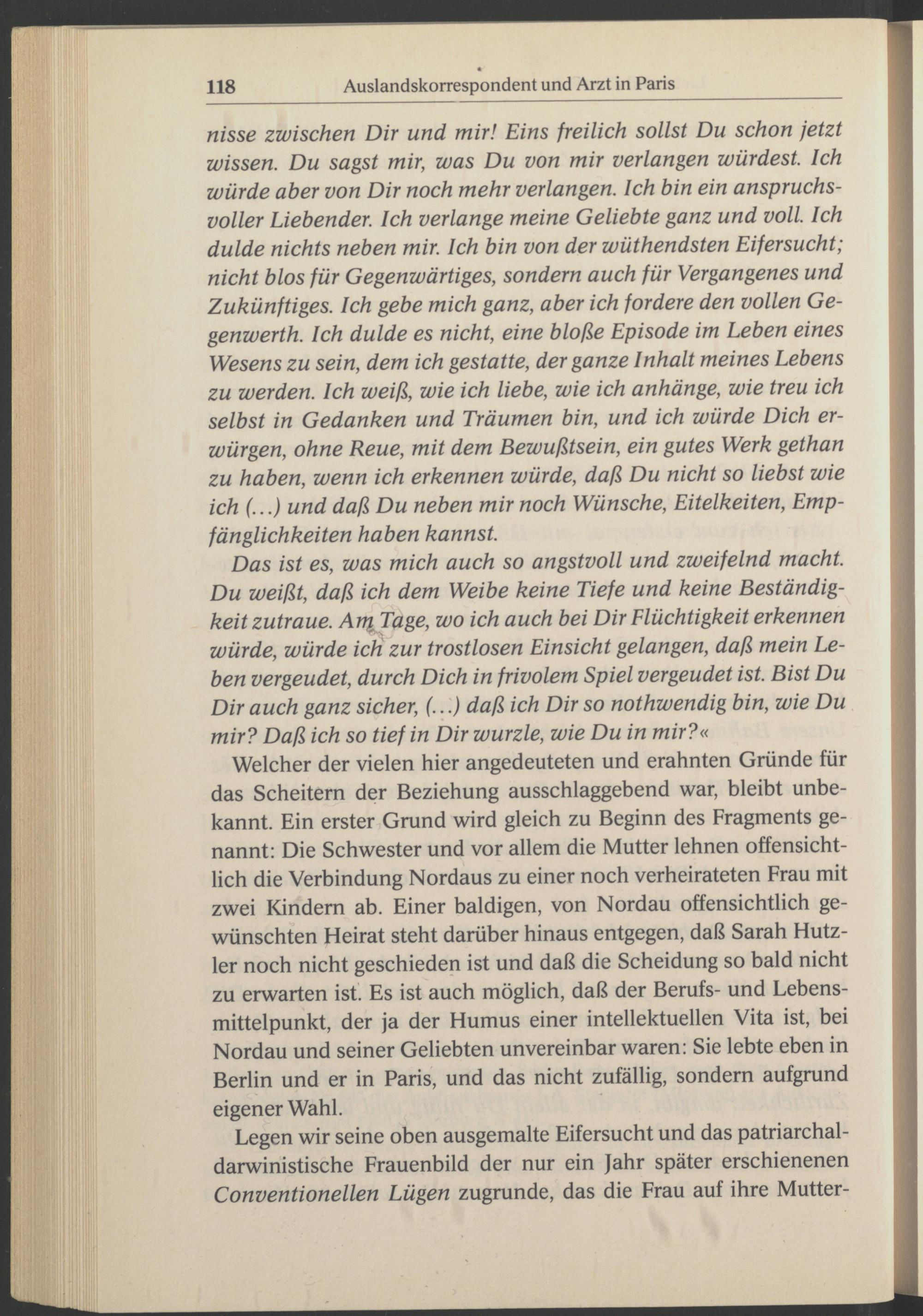 Welcher der vielen hier angedeuteten und erahnten Gründe für das Scheitern der Beziehung ausschlaggebend war, bleibt unbekannt. Ein erster Grund wird gleich zu Beginn des Fragments genannt: Die Schwester und vor allem die Mutter lehnen offensichtlich die Verbindung Nordaus zu einer noch verheirateten Frau mit zwei Kindern ab. Einer baldigen, von Nordau offensichtlich gewünschten Heirat steht darüber hinaus entgegen, daß Sarah Hutzier noch nicht geschieden ist und daß die Scheidung so bald nicht zu erwarten ist. Es ist auch möglich, daß der Berufs- und Lebensmittelpunkt, der ja der Humus einer intellektuellen Vita ist, bei Nordau und seiner Geliebten unvereinbar waren: Sie lebte eben in Berlin und er in Paris , und das nicht zufällig, sondern aufgrund eigener Wahl.