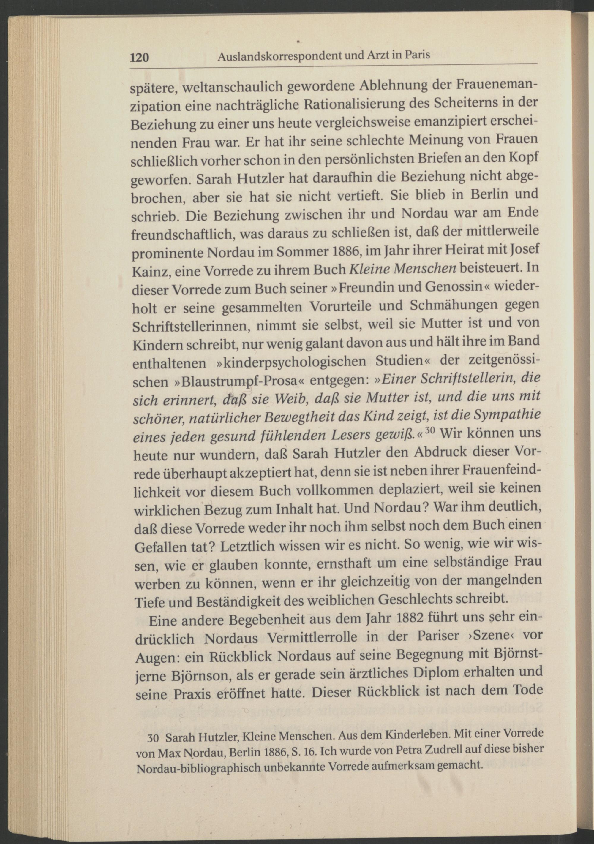 spätere, weltanschaulich gewordene Ablehnung der Frauenemanzipation eine nachträgliche Rationalisierung des Scheiterns in der Beziehung zu einer uns heute vergleichsweise emanzipiert erscheinenden Frau war. Er hat ihr seine schlechte Meinung von Frauen schließlich vorher schon in den persönlichsten Briefen an den Kopf geworfen. Sarah Hutzier hat daraufhin die Beziehung nicht abgebrochen, aber sie hat sie nicht vertieft. Sie blieb in Berlin und schrieb. Die Beziehung zwischen ihr und Nordau war am Ende freundschaftlich, was daraus zu schließen ist, daß der mittlerweile prominente Nordau im Sommer 1886, im Jahr ihrer Heirat mit Josef Kainz , eine Vorrede zu ihrem Buch Kleine Menschen beisteuert. In dieser Vorrede zum Buch seiner »Freundin und Genossin« wiederholt er seine gesammelten Vorurteile und Schmähungen gegen Schriftstellerinnen, nimmt sie selbst, weil sie Mutter ist und von Kindern schreibt, nur wenig galant davon aus und hält ihre im Band enthaltenen »kinderpsychologischen Studien« der zeitgenössischen »Blaustrumpf-Prosa« entgegen: »Einer Schriftstellerin, die sich erinnert, daß sie Weib, daß sie Mutter ist, und die uns mit schöner, natürlicher Bewegtheit das Kind zeigt, ist die Sympathie eines jeden gesund fühlenden Lesers gewiß.« 30 Wir können uns heute nur wundern, daß Sarah Hutzier den Abdruck dieser Vorrede überhaupt akzeptiert hat, denn sie ist neben ihrer Frauenfeindlichkeit vor diesem Buch vollkommen deplaziert, weil sie keinen wirklichen Bezug zum Inhalt hat. Und Nordau ? War ihm deutlich, daß diese Vorrede weder ihr noch ihm selbst noch dem Buch einen Gefallen tat? Letztlich wissen wir es nicht. So wenig, wie wir wissen, wie er glauben konnte, ernsthaft um eine selbständige Frau werben zu können, wenn er ihr gleichzeitig von der mangelnden Tiefe und Beständigkeit des weiblichen Geschlechts schreibt.