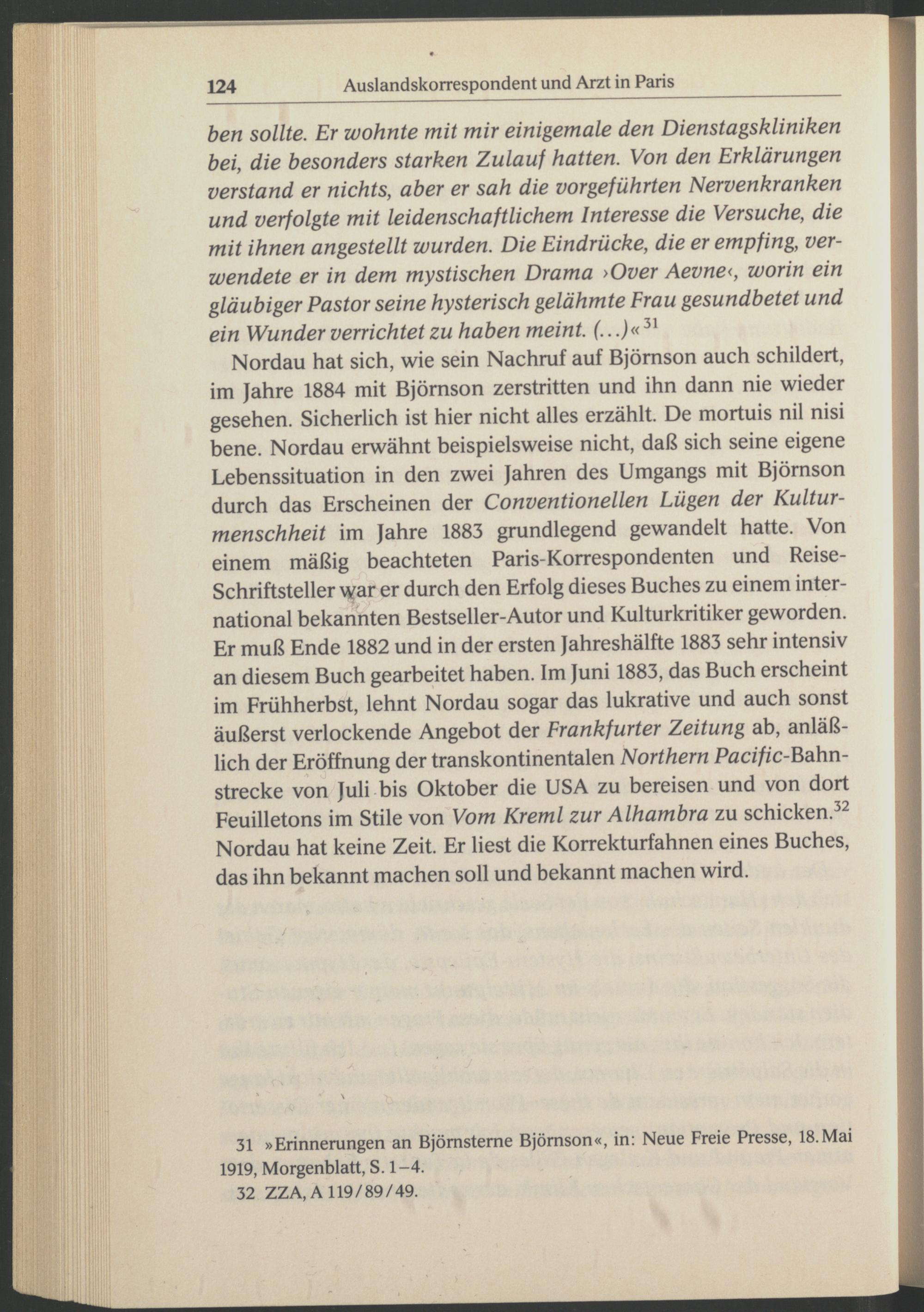 Nordau hat sich, wie sein Nachruf auf Bjömson auch schildert, im Jahre 1884 mit Bjömson zerstritten und ihn dann nie wieder gesehen. Sicherlich ist hier nicht alles erzählt. De mortuis nil nisi bene. Nordau erwähnt beispielsweise nicht, daß sich seine eigene Lebenssituation in den zwei Jahren des Umgangs mit Björnson durch das Erscheinen der Conventionellen Lügen der Kulturmenschheit im Jahre 1883 grundlegend gewandelt hatte. Von einem mäßig beachteten Paris -Korrespondenten und Reise- Schriftsteller \yar er durch den Erfolg dieses Buches zu einem international bekannten Bestseller-Autor und Kulturkritiker geworden. Er muß Ende 1882 und in der ersten Jahreshälfte 1883 sehr intensiv an diesem Buch gearbeitet haben. Im Juni 1883, das Buch erscheint im Frühherbst, lehnt Nordau sogar das lukrative und auch sonst äußerst verlockende Angebot der Frankfurter Zeitung ab, anläßlich der Eröffnung der transkontinentalen Northern Pacific - Bahnstrecke von Juli bis Oktober die USA zu bereisen und von dort Feuilletons im Stile von Vom Kreml zur Alhambra zu schicken. 32 Nordau hat keine Zeit. Er liest die Korrekturfahnen eines Buches, das ihn bekannt machen soll und bekannt machen wird.