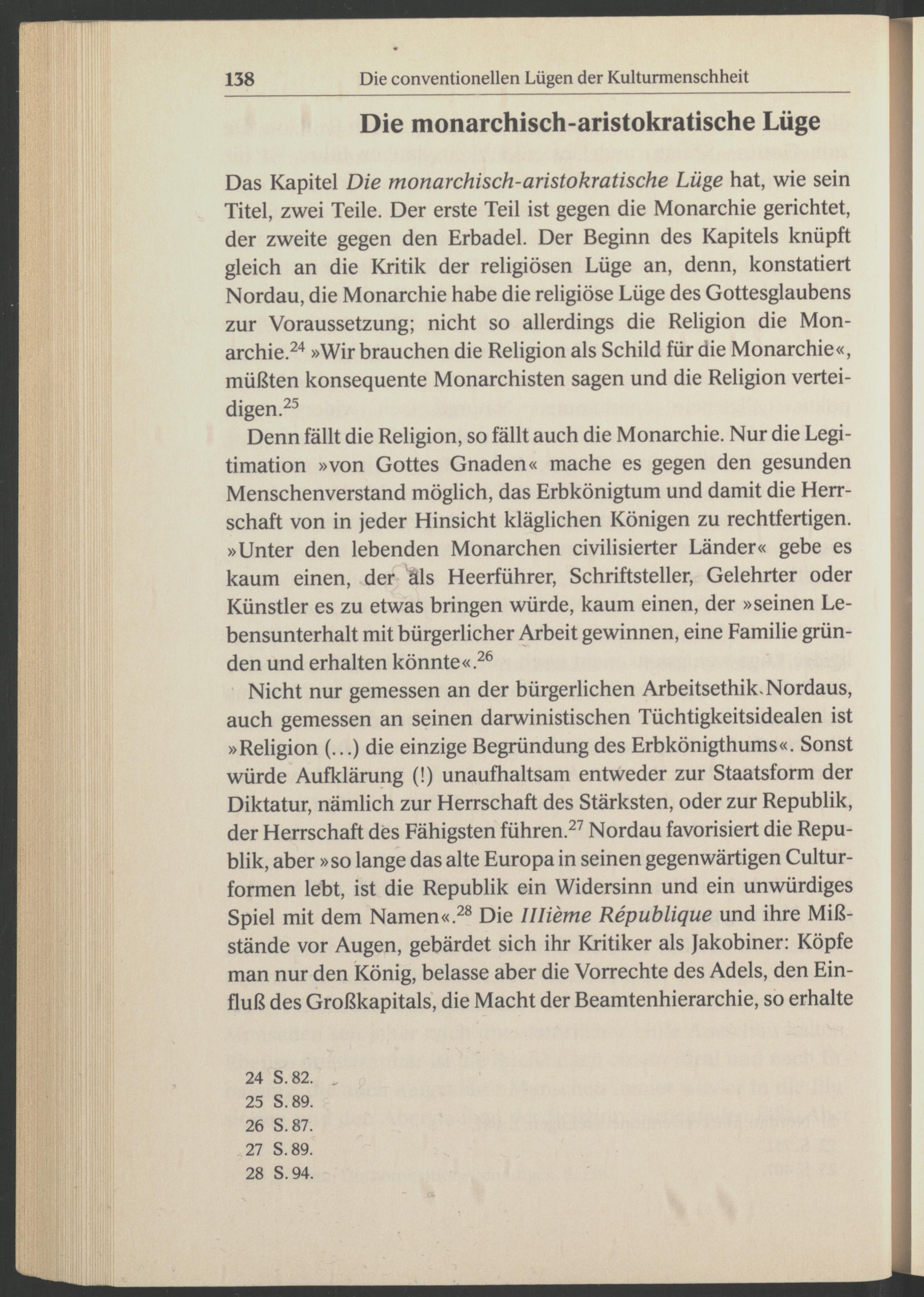 Das Kapitel Die monarchisch-aristokratische Lüge hat, wie sein Titel, zwei Teile. Der erste Teil ist gegen die Monarchie gerichtet, der zweite gegen den Erbadel. Der Beginn des Kapitels knüpft gleich an die Kritik der religiösen Lüge an, denn, konstatiert Nordau, die Monarchie habe die religiöse Lüge des Gottesglaubens zur Voraussetzung; nicht so allerdings die Religion die Monarchie . 24 »Wir brauchen die Religion als Schild für die Monarchie«, müßten konsequente Monarchisten sagen und die Religion verteidigen . 25