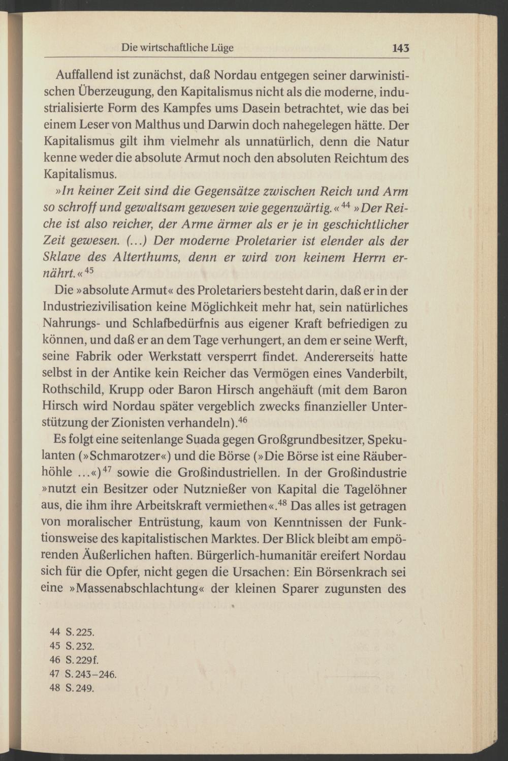 Auffallend ist zunächst, daß Nordau entgegen seiner darwinisti- schen Überzeugung, den Kapitalismus nicht als die moderne, industrialisierte Form des Kampfes ums Dasein betrachtet, wie das bei einem Leser von Malthus und Darwin doch nahegelegen hätte. Der Kapitalismus gilt ihm vielmehr als unnatürlich, denn die Natur kenne weder die absolute Armut noch den absoluten Reichtum des Kapitalismus .