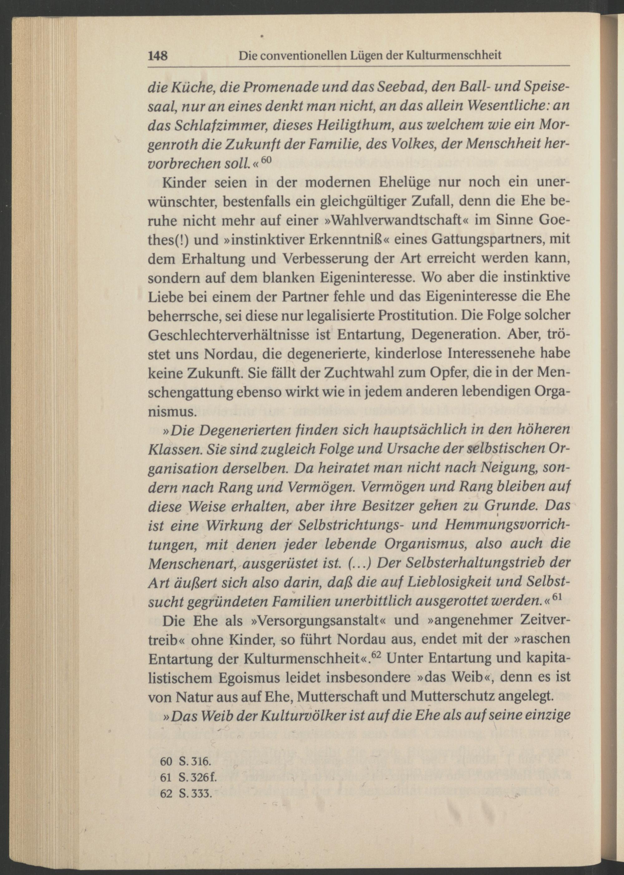 Kinder seien in der modernen Ehelüge nur noch ein unerwünschter, bestenfalls ein gleichgültiger Zufall, denn die Ehe beruhe nicht mehr auf einer »Wahlverwandtschaft« im Sinne Goe- thes(!) und »instinktiver Erkenntnis« eines Gattungspartners, mit dem Erhaltung und Verbesserung der Art erreicht werden kann, sondern auf dem blanken Eigeninteresse. Wo aber die instinktive Liebe bei einem der Partner fehle und das Eigeninteresse die Ehe beherrsche, sei diese nur legalisierte Prostitution. Die Folge solcher Geschlechterverhältnisse ist Entartung, Degeneration. Aber, tröstet uns Nordau , die degenerierte, kinderlose Interessenehe habe keine Zukunft. Sie fällt der Zuchtwahl zum Opfer, die in der Menschengattung ebenso wirkt wie in jedem anderen lebendigen Organismus.