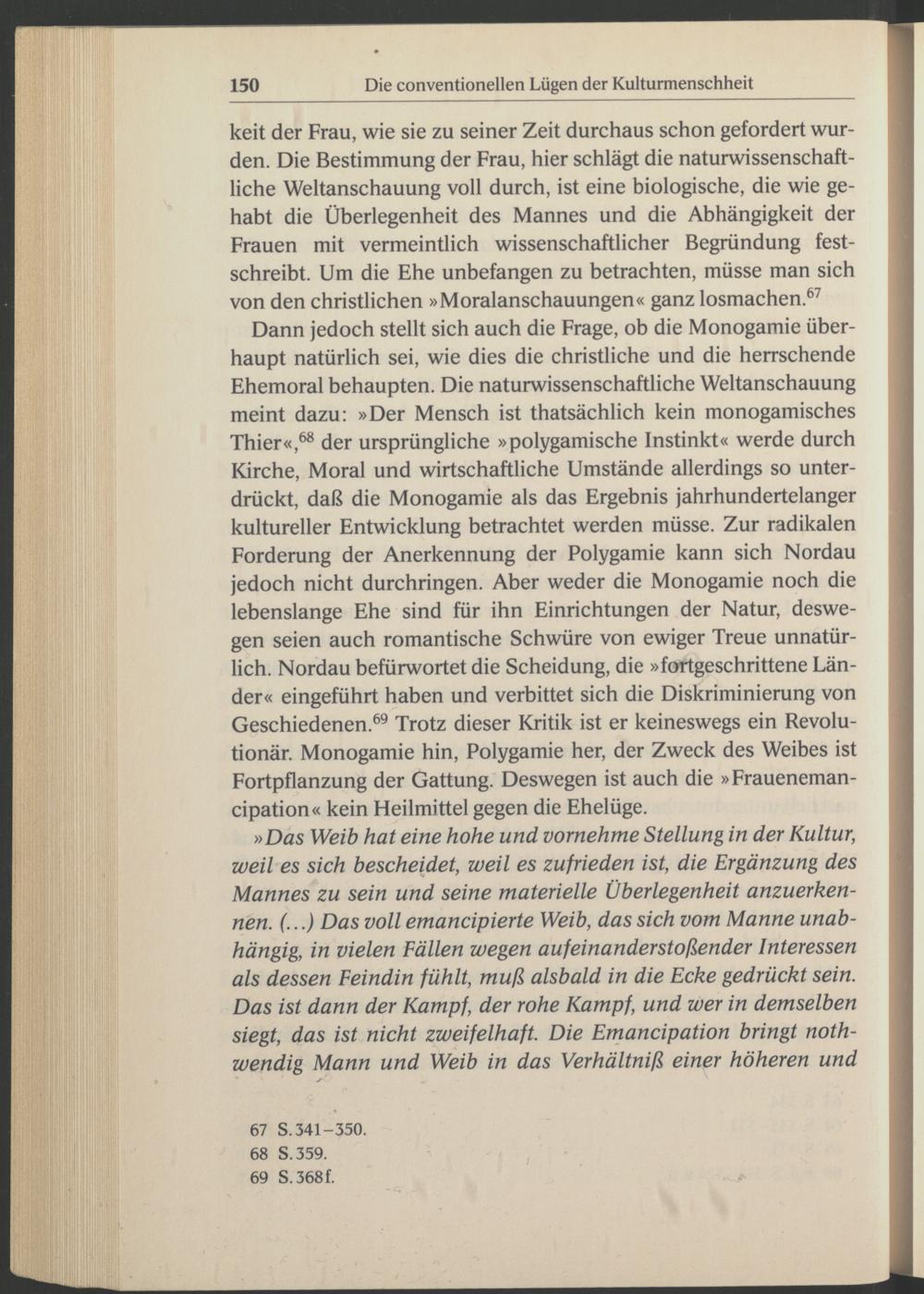 Dann jedoch stellt sich auch die Frage, ob die Monogamie überhaupt natürlich sei, wie dies die christliche und die herrschende Ehemoral behaupten. Die naturwissenschaftliche Weltanschauung meint dazu: »Der Mensch ist thatsächlich kein monogamisches Thier «, 68 der ursprüngliche »polygamische Instinkt« werde durch Kirche, Moral und wirtschaftliche Umstände allerdings so unterdrückt, daß die Monogamie als das Ergebnis jahrhundertelanger kultureller Entwicklung betrachtet werden müsse. Zur radikalen Forderung der Anerkennung der Polygamie kann sich Nordau jedoch nicht durchringen. Aber weder die Monogamie noch die lebenslange Ehe sind für ihn Einrichtungen der Natur, deswegen seien auch romantische Schwüre von ewiger Treue unnatürlich. Nordau befürwortet die Scheidung, die »fortgeschrittene Länder« eingeführt haben und verbittet sich die Diskriminierung von Geschiedenen . 69 Trotz dieser Kritik ist er keineswegs ein Revolutionär. Monogamie hin, Polygamie her, der Zweck des Weibes ist Fortpflanzung der Gattung. Deswegen ist auch die »Fraueneman- cipation« kein Heilmittel gegen die Ehelüge.