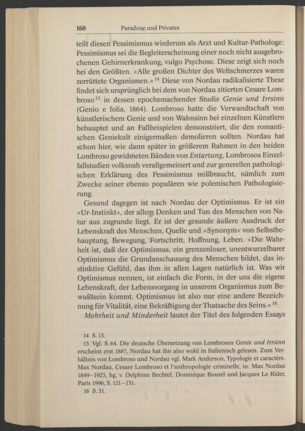 teilt diesen Pessimismus wiederum als Arzt und Kultur-Pathologe: Pessimismus sei die Begleiterscheinung einer noch nicht ausgebrochenen Gehirnerkrankung, vulgo Psychose. Diese zeigt sich noch bei den Größten. »Alle großen Dichter des Weltschmerzes waren zerrüttete Organismen.« 14 Diese von Nordau radikalisierte These findet sich ursprünglich bei dem von Nordau zitierten Cesare Lom- broso 15 in dessen epochemachender Studie Genie und Irrsinn (Genio e folia, 1864). Lombroso hatte die Verwandtschaft von künstlerischem Genie und von Wahnsinn bei einzelnen Künstlern behauptet und an Fallbeispielen demonstriert, die den romantischen Geniekult einigermaßen demolieren sollten. Nordau hat schon hier, wie dann später in größerem Rahmen in den beiden Lombroso gewidmeten Bänden von Entartung, Lombrosos Einzelfallstudien volksnah verallgemeinert und zur generellen pathologischen Erklärung des Pessimismus mißbraucht, nämlich zum Zwecke seiner ebenso populären wie polemischen Pathologisie- rung.