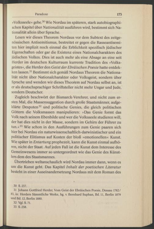 Lesen wir dieses Theorem Nordaus vor dem Subtext des zeitgenössischen Antisemitismus, bestreitet er gegen die Rasseantisemiten hier implizit noch einmal die Erblichkeit spezifisch jüdischer Eigenschaften oder gar die Existenz eines Nationalcharakters des jüdischen Volkes. Dies ist auch mehr als eine Absage an eine seit Herder im deutschen Kulturraum kurrente Tradition des »Volks geistes «, die Herder den Geist der Ebräischen Poesie hatte entdek- ken lassen . 31 Bestimmt sich gemäß Nordaus Theorem die Nationalität nicht über Nationalcharakter oder Volksgeist, sondern über Sprache und wenden wir dieses Theorem auf Nordau selbst an, ist er als deutschsprachiger Schriftsteller nicht mehr Ungar und Jude, sondern Deutscher .