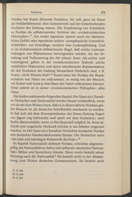 Die beiden aufeinander folgenden Kapitel Der Staat als Charakter-Vernichter und Nationalität werden besser verständlich, wenn wir sie mit dem Wissen lesen, daß es in diesen Jahren Nordaus großer Wunsch ist, als deutscher Schriftsteller anerkannt zu werden. Er hat sich mit dem Korrespondenten der Kreuz-Zeitung Eugen von Jagow eng befreundet und spielt mit dem Gedanken, nach Berlin überzusiedeln, wenn es ihm finanziell möglich ist. Seine jüdische und ungarische Herkunft möchte er am liebsten vergessen machen, ln Der Staat als Charakter-Vernichter trompetet Nordau sein deutsches Glaubensbekenntnis heraus: Die Deutschen seien »das erste und mächtigste Kulturvolk der Erde «. 39