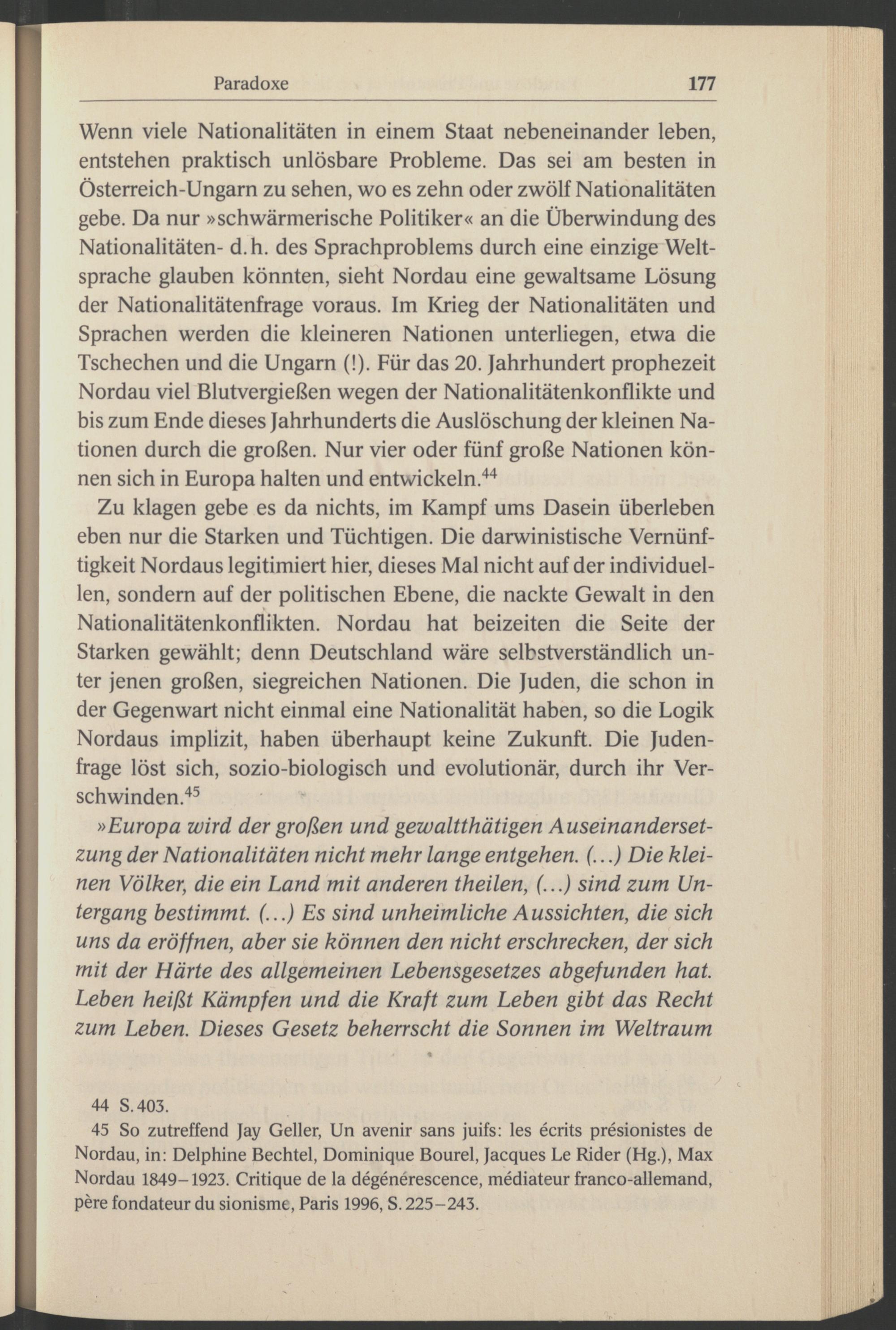 Zu klagen gebe es da nichts, im Kampf ums Dasein überleben eben nur die Starken und Tüchtigen. Die darwinistische Vernünftigkeit Nordaus legitimiert hier, dieses Mal nicht auf der individuellen, sondern auf der politischen Ebene, die nackte Gewalt in den Nationalitätenkonflikten. Nordau hat beizeiten die Seite der Starken gewählt; denn Deutschland wäre selbstverständlich unter jenen großen, siegreichen Nationen. Die Juden, die schon in der Gegenwart nicht einmal eine Nationalität haben, so die Logik Nordaus implizit, haben überhaupt keine Zukunft. Die Judenfrage löst sich, sozio-biologisch und evolutionär, durch ihr Verschwinden. 45