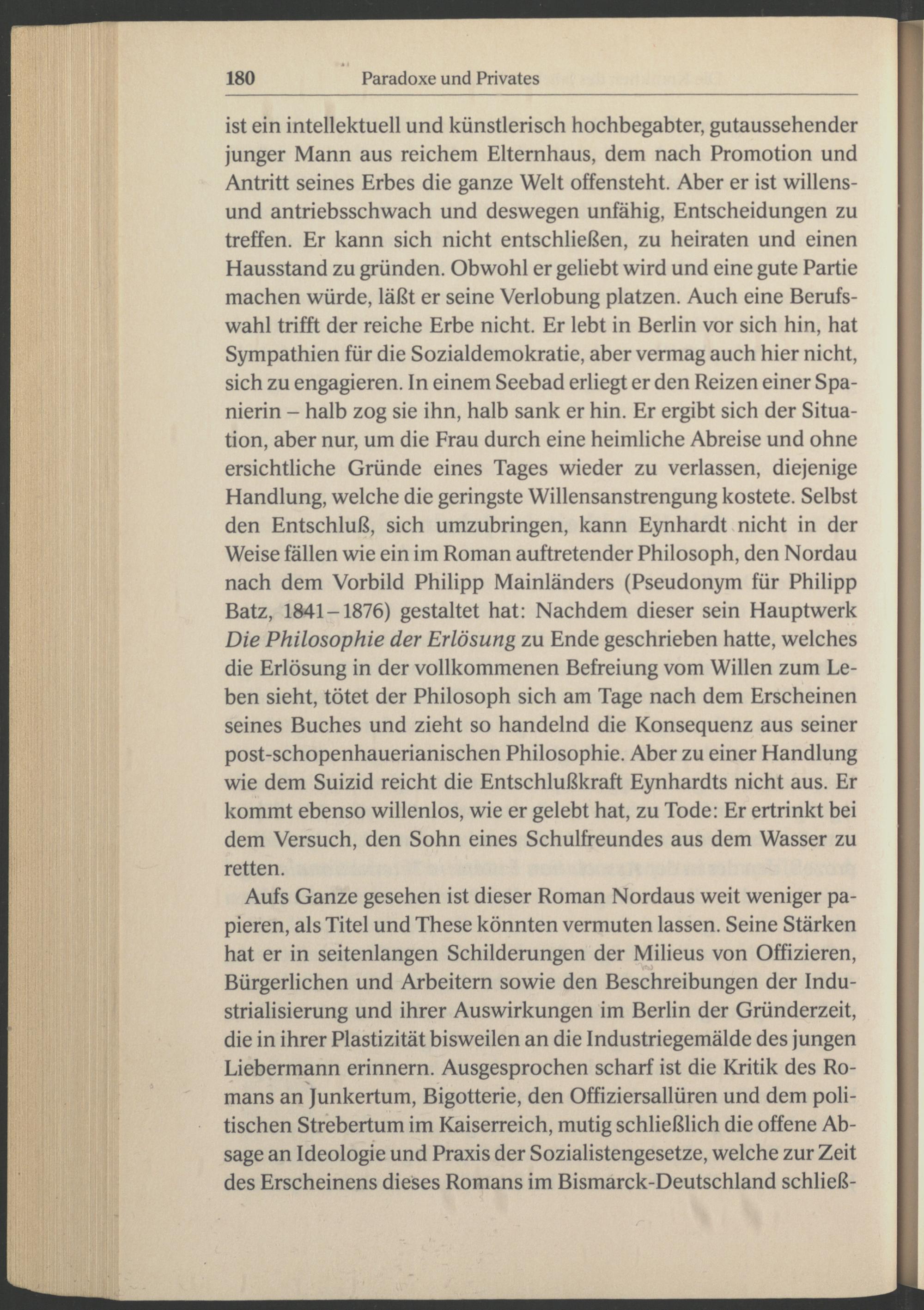 ist ein intellektuell und künstlerisch hochbegabter, gutaussehender junger Mann aus reichem Elternhaus, dem nach Promotion und Antritt seines Erbes die ganze Welt offensteht. Aber er ist willens- und antriebsschwach und deswegen unfähig, Entscheidungen zu treffen. Er kann sich nicht entschließen, zu heiraten und einen Hausstand zu gründen. Obwohl er geliebt wird und eine gute Partie machen würde, läßt er seine Verlobung platzen. Auch eine Berufswahl trifft der reiche Erbe nicht. Er lebt in Berlin vor sich hin, hat Sympathien für die Sozialdemokratie, aber vermag auch hier nicht, sich zu engagieren. In einem Seebad erliegt er den Reizen einer Spanierin - halb zog sie ihn, halb sank er hin. Er ergibt sich der Situation, aber nur, um die Frau durch eine heimliche Abreise und ohne ersichtliche Gründe eines Tages wieder zu verlassen, diejenige Handlung, welche die geringste Willensanstrengung kostete. Selbst den Entschluß, sich umzubringen, kann Eynhardt nicht in der Weise fällen wie ein im Roman auftretender Philosoph, den Nordau nach dem Vorbild Philipp Mainländers (Pseudonym für Philipp Batz , 1841-1876) gestaltet hat: Nachdem dieser sein Hauptwerk Die Philosophie der Erlösung zu Ende geschrieben hatte, welches die Erlösung in der vollkommenen Befreiung vom Willen zum Leben sieht, tötet der Philosoph sich am Tage nach dem Erscheinen seines Buches und zieht so handelnd die Konsequenz aus seiner post-schopenhauerianischen Philosophie. Aber zu einer Handlung wie dem Suizid reicht die Entschlußkraft Eynhardts nicht aus. Er kommt ebenso willenlos, wie er gelebt hat, zu Tode: Er ertrinkt bei dem Versuch, den Sohn eines Schulfreundes aus dem Wasser zu retten.