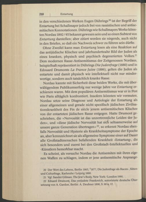 Ohne Zweifel kann man Entartung lesen als eine Reaktion auf das antijüdische Klischee und jahrhundertealte Bild der Juden als eines kranken, physisch und psychisch degenerierten Volkes. 21 Dem modernen Rasse-Antisemitismus der Zeitgenossen Nordaus, beispielhaft repräsentiert in Dührings Die Juden frage (1880) und in Edouard Drumonts La France Juive (1886), gelten die Juden als entartete und damit physisch wie intellektuell nicht nur minderwertige, sondern auch tatsächlich kranke Rasse.