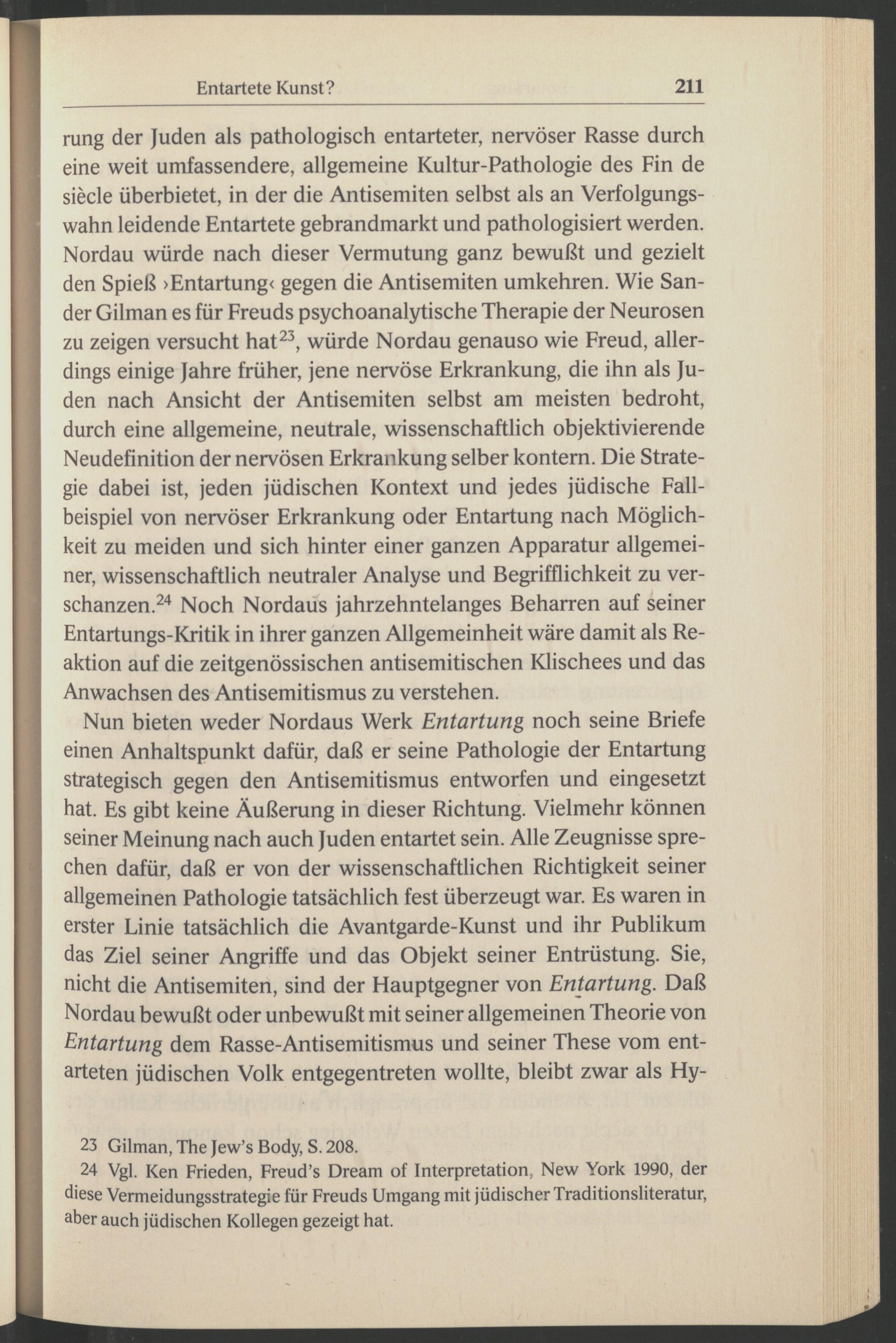 rung der Juden als pathologisch entarteter, nervöser Rasse durch eine weit umfassendere, allgemeine Kultur-Pathologie des Fin de siede überbietet, in der die Antisemiten selbst als an Verfolgungswahn leidende Entartete gebrandmarkt und pathologisiert werden. Nordau würde nach dieser Vermutung ganz bewußt und gezielt den Spieß >Entartung< gegen die Antisemiten umkehren. Wie San der Gilman es für Freuds psychoanalytische Therapie der Neurosen zu zeigen versucht hat 23 , würde Nordau genauso wie Freud, allerdings einige Jahre früher, jene nervöse Erkrankung, die ihn als Juden nach Ansicht der Antisemiten selbst am meisten bedroht, durch eine allgemeine, neutrale, wissenschaftlich objektivierende Neudefinition der nervösen Erkrankung selber kontern. Die Strategie dabei ist, jeden jüdischen Kontext und jedes jüdische Fallbeispiel von nervöser Erkrankung oder Entartung nach Möglichkeit zu meiden und sich hinter einer ganzen Apparatur allgemeiner, wissenschaftlich neutraler Analyse und Begrifflichkeit zu verschanzen . 24 Noch Nordaus jahrzehntelanges Beharren auf seiner Entartungs-Kritik in ihrer ganzen Allgemeinheit wäre damit als Reaktion auf die zeitgenössischen antisemitischen Klischees und das Anwachsen des Antisemitismus zu verstehen.
