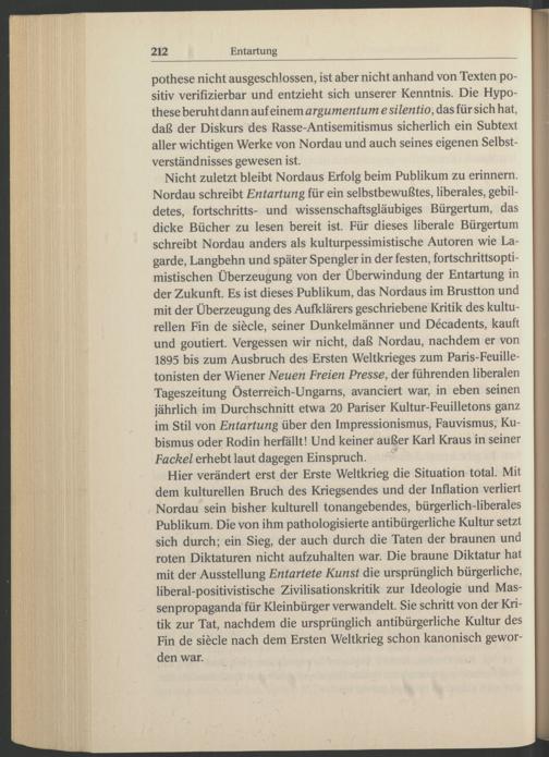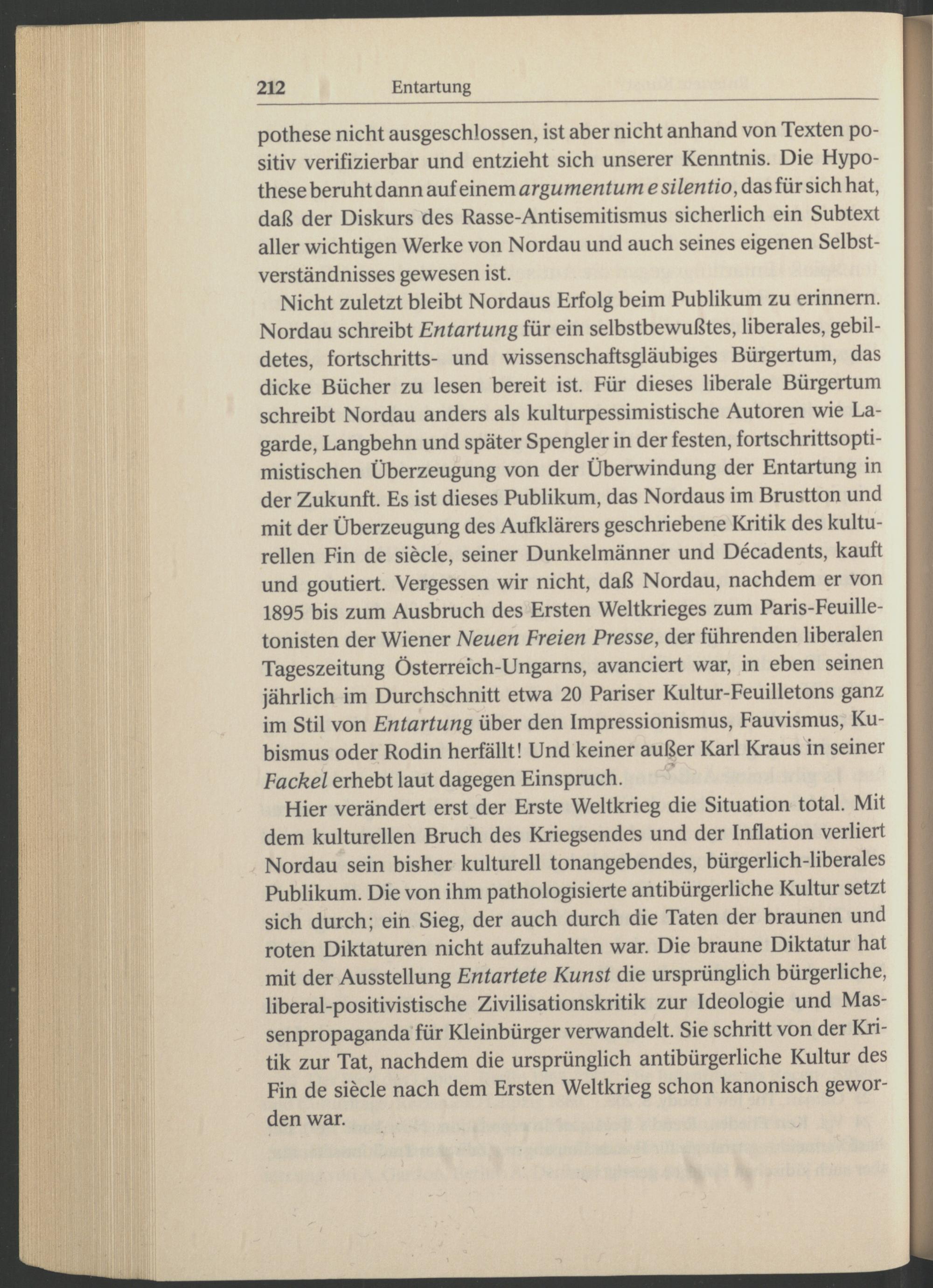 Nicht zuletzt bleibt Nordaus Erfolg beim Publikum zu erinnern. Nordau schreibt Entartung für ein selbstbewußtes, liberales, gebildetes, fortschritts- und wissenschaftsgläubiges Bürgertum, das dicke Bücher zu lesen bereit ist. Für dieses liberale Bürgertum schreibt Nordau anders als kulturpessimistische Autoren wie La- garde, Langbehn und später Spengler in der festen, fortschrittsoptimistischen Überzeugung von der Überwindung der Entartung in der Zukunft. Es ist dieses Publikum, das Nordaus im Brustton und mit der Überzeugung des Aufklärers geschriebene Kritik des kulturellen Fin de siede, seiner Dunkelmänner und Decadents, kauft und goutiert. Vergessen wir nicht, daß Nordau , nachdem er von 1895 bis zum Ausbruch des Ersten Weltkrieges zum Paris -Feuille- tonisten der Wiener Neuen Freien Presse, der führenden liberalen Tageszeitung Österreich -Ungams, avanciert war, in eben seinen jährlich im Durchschnitt etwa 20 Pariser Kultur-Feuilletons ganz im Stil von Entartung über den Impressionismus, Fauvismus, Ku bismus oder Rodin herfällt! Und keiner außer Karl Kraus in seiner Fackel erhebt laut dagegen Einspruch. ^