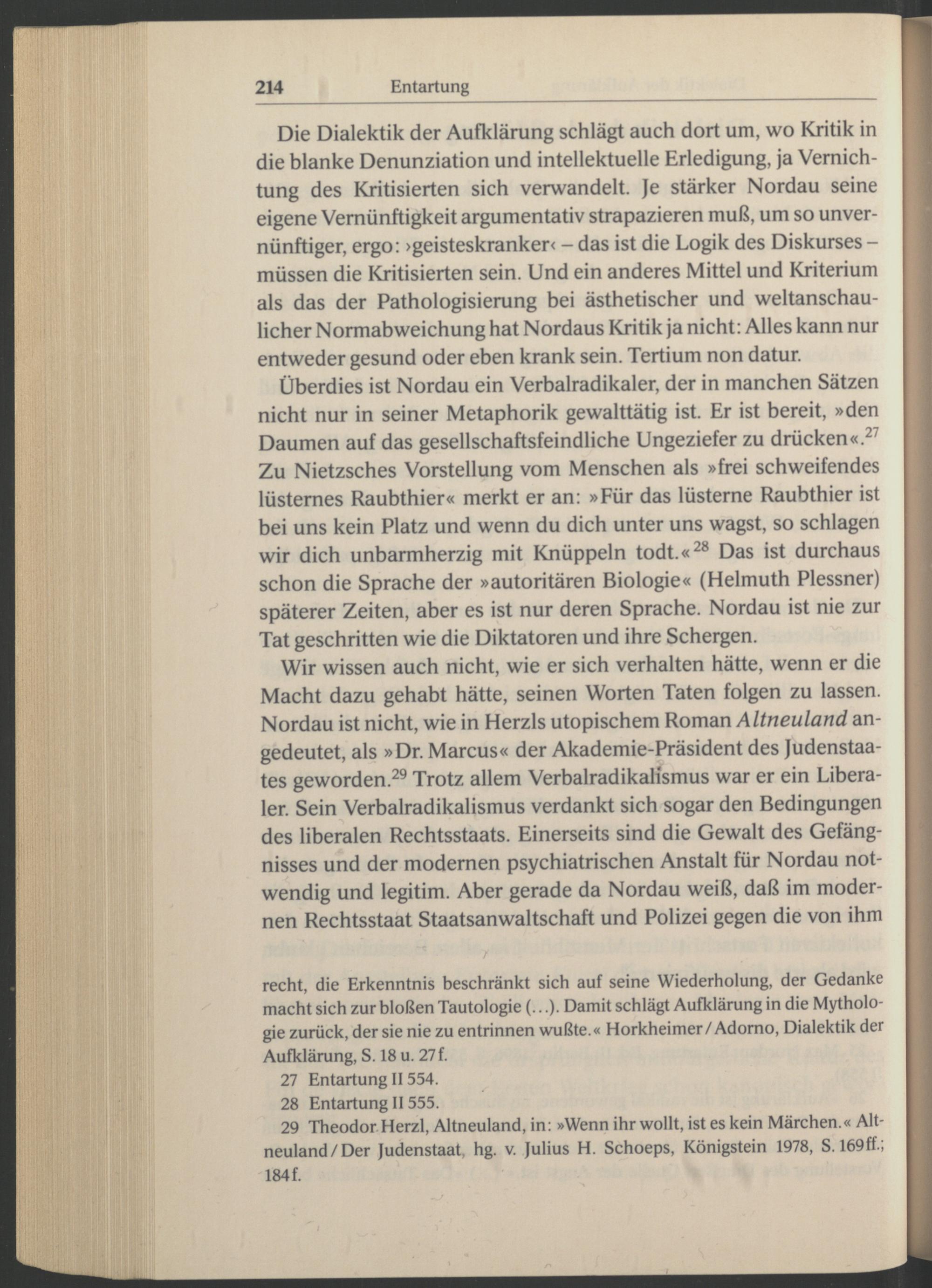 Überdies ist Nordau ein Verbalradikaler, der in manchen Sätzen nicht nur in seiner Metaphorik gewalttätig ist. Er ist bereit, »den Daumen auf das gesellschaftsfeindliche Ungeziefer zu drücken «. 27 Zu Nietzsches Vorstellung vom Menschen als »frei schweifendes lüsternes Raubthier« merkt er an: »Für das lüsterne Raubthier ist bei uns kein Platz und wenn du dich unter uns wagst, so schlagen wir dich unbarmherzig mit Knüppeln todt .« 28 Das ist durchaus schon die Sprache der »autoritären Biologie« (Helmuth Plessner ) späterer Zeiten, aber es ist nur deren Sprache. Nordau ist nie zur Tat geschritten wie die Diktatoren und ihre Schergen.