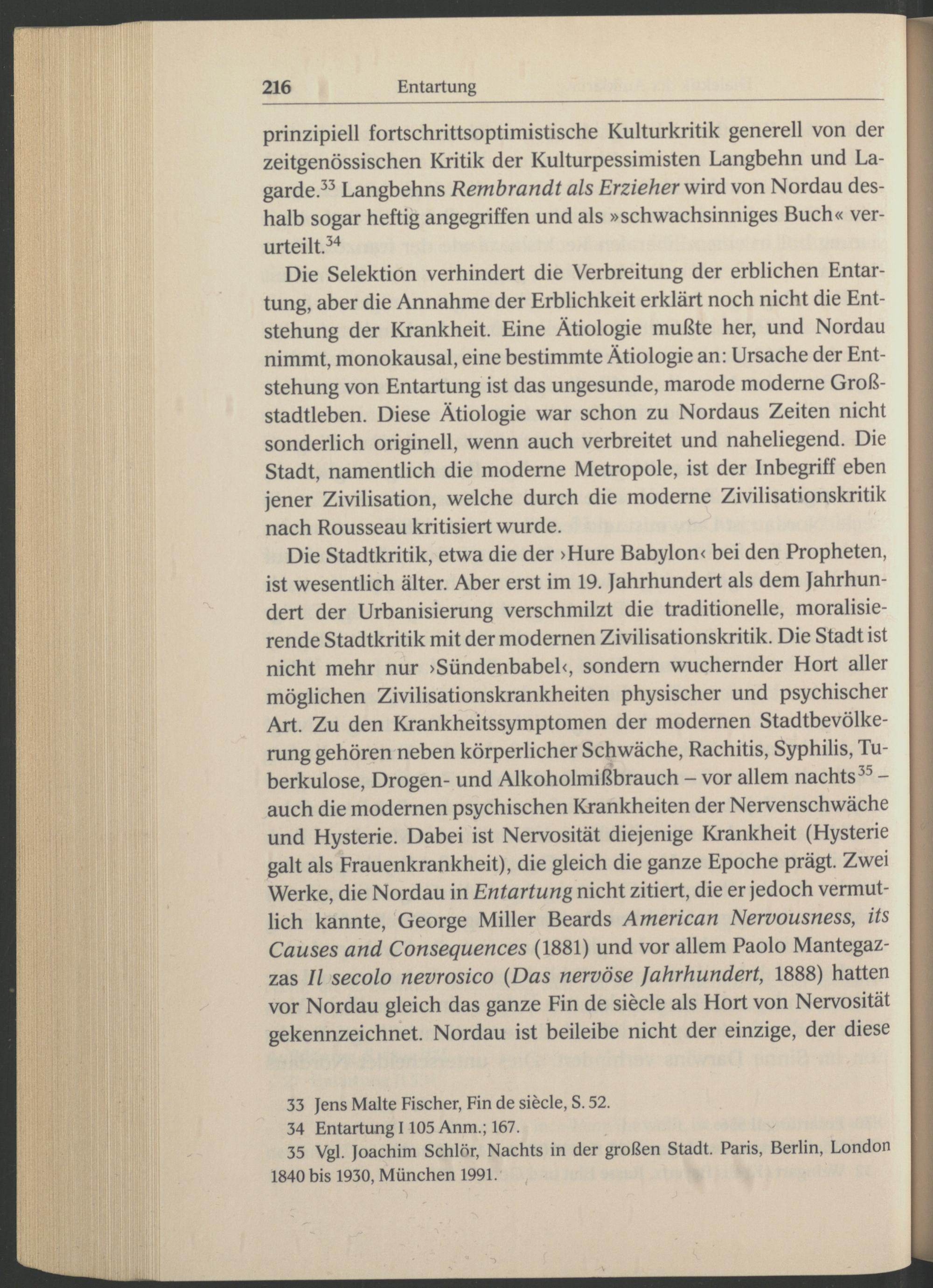 Die Stadtkritik, etwa die der >Hure Babylon< bei den Propheten, ist wesentlich älter. Aber erst im 19. Jahrhundert als dem Jahrhundert der Urbanisierung verschmilzt die traditionelle, moralisierende Stadtkritik mit der modernen Zivilisationskritik. Die Stadt ist nicht mehr nur >Sündenbabel<, sondern wuchernder Hort aller möglichen Zivilisationskrankheiten physischer und psychischer Art. Zu den Krankheitssymptomen der modernen Stadtbevölkerung gehören neben körperlicher Schwäche, Rachitis, Syphilis, Tuberkulose, Drogen- und Alkoholmißbrauch - vor allem nachts 35 - auch die modernen psychischen Krankheiten der Nervenschwäche und Hysterie. Dabei ist Nervosität diejenige Krankheit (Hysterie ‘ galt als Frauenkrankheit), die gleich die ganze Epoche prägt. Zwei Werke, die Nordau in Entartung nicht zitiert, die er jedoch vermutlich kannte, George Miller Beards American Nervousness, its Causes and Consequences (1881) und vor allem Paolo Mantegaz- zas II secolo nevrosico (Das nervöse Jahrhundert, 1888) hatten vor Nordau gleich das ganze Fin de siede als Hort von Nervosität gekennzeichnet. Nordau ist beileibe nicht der einzige, der diese
