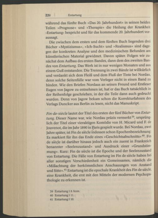 Fin-de-siecle lautet der Titel des ersten der fünf Bücher von Entartung. Dieser Name war, wie Nordau präzis vermerkt 39 , ursprünglich der Titel einer vieraktigen Komödie von H. Micard und F. de Jouvenot, die im Jahr 1890 in Paris gespielt wurde. Bei Nordau , zwei Jahre später, ist Fin de siede indessen schon Epochenbezeichnung: Es markiert für ihn das Ende eines »Geschichtsabschnitts« 40 . Fin de siede ist darüber hinaus jedoch auch ein zuerst in Frankreich benannter »Seelenzustand« und Ausdruck einer »Grundstimmung«. Kurz: Fin de siede ist die Epoche und der Seelenzustand von Entartung. Die Fälle von Entartung im Fin de siede haben bei aller sonstigen Verschiedenheit ein Gemeinsames, nämlich die »Mißachtung der herkömmlichen Anschauungen von Anstand und Sitte«. 41 Entartung ist die epochale Krankheit des Fin de siede, eine Krankheit, die erst mit den Mitteln der modernen Psychopathologie zu erkennen ist.