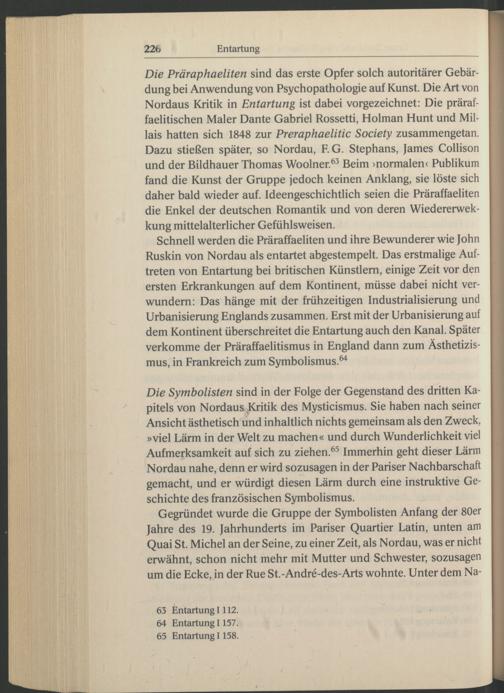 Die Symbolisten sind in der Folge der Gegenstand des dritten Kapitels von Nordaus Kritik des Mysticismus. Sie haben nach seiner Ansicht ästhetisch und inhaltlich nichts gemeinsam als den Zweck, »viel Lärm in der Welt zu machen« und durch Wunderlichkeit viel Aufmerksamkeit auf sich zu ziehen. 65 Immerhin geht dieser Lärm Nordau nahe, denn er wird sozusagen in der Pariser Nachbarschaft gemacht, und er würdigt diesen Lärm durch eine instruktive Geschichte des französischen Symbolismus.
