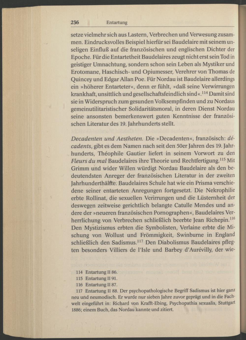 setze vielmehr sich aus Lastern, Verbrechen und Verwesung zusammen. Eindrucksvolles Beispiel hierfür sei Baudelaire mit seinem unseligen Einfluß auf die französischen und englischen Dichter der Epoche. Für die Entartetheit Baudelaires zeugt nicht erst sein Tod in geistiger Umnachtung, sondern schon sein Leben als Mystiker und Erotomane, Haschisch- und Opiumesser, Verehrer von Thomas de Quincey und Edgar Allan Poe . Für Nordau ist Baudelaire allerdings ein »höherer Entarteter«, denn er fühlt, »daß seine Verwirrungen krankhaft, unsittlich und gesellschaftsfeindlich sind«. 114 Damit sind sie in Widerspruch zum gesunden Volksempfinden und zu Nordaus gemeinutilitaristischer Solidaritätsmoral, in deren Dienst Nordau seine ansonsten bemerkenswert guten Kenntnisse der französi schen Literatur des 19. Jahrhunderts stellt.