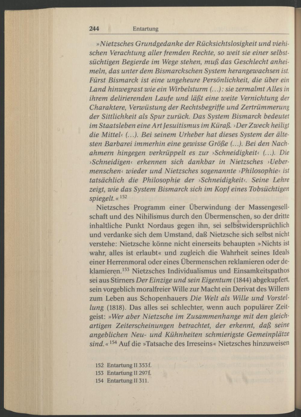 inhaltliche Punkt Nordaus gegen ihn, sei selbstwidersprüchlich und verdanke sich dem Umstand, daß Nietzsche sich selbst nicht verstehe: Nietzsche könne nicht einerseits behaupten »Nichts ist wahr, alles ist erlaubt« und zugleich die Wahrheit seines Ideals einer Herrenmoral oder eines Übermenschen reklamieren oder deklamieren. 153 Nietzsches Individualismus und Einsamkeitspathos sei aus Stirners Der Einzige und sein Eigentum (1844) abgekupfert, sein vorgeblich moralfreier Wille zur Macht ein Derivat des Willens zum Leben aus Schopenhauers Die Welt als Wille und Vorstel lung (1818). Das alles sei schlechter, wenn auch populärer Zeitgeist: »Wer aber Nietzsche im Zusammenhänge mit den gleichartigen Zeiterscheinungen betrachtet, der erkennt, daß seine angeblichen Neu- und Kühnheiten schmierigste Gemeinplätze sind .« 154 Auf die »Tatsache des Irreseins« Nietzsches hinzuweisen