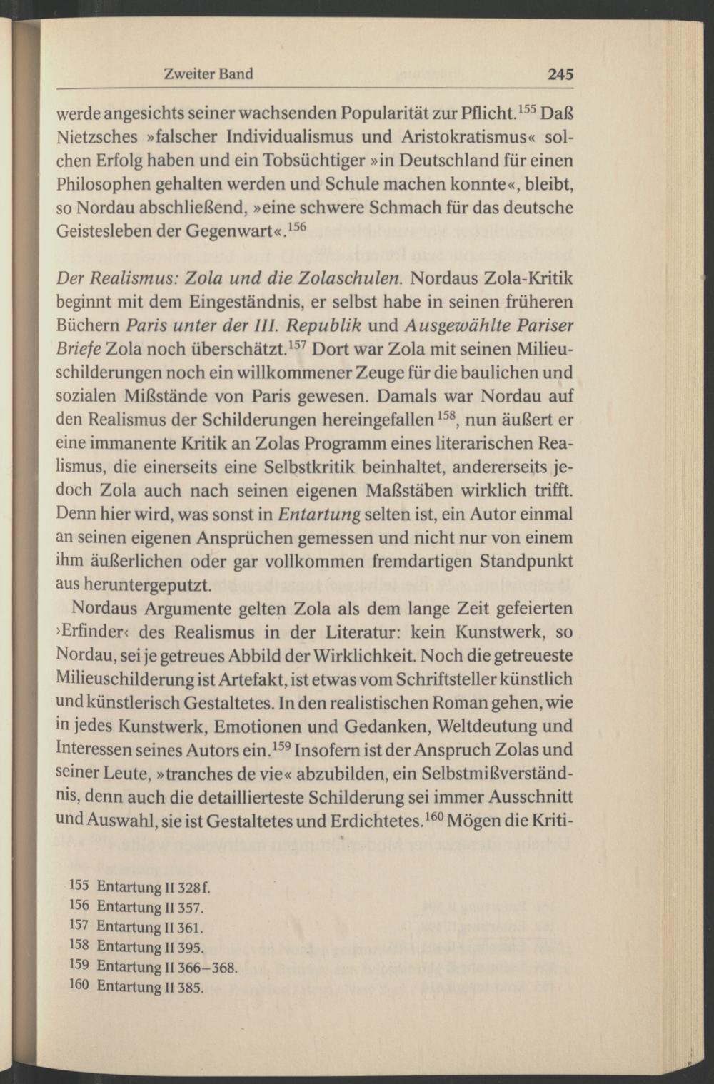 Der Realismus: Zola und die Zolaschulen. Nordaus Zola -Kritik beginnt mit dem Eingeständnis, er selbst habe in seinen früheren Büchern Paris unter der Hl. Republik und Ausgewählte Pariser Briefe Zola noch überschätzt . 157 Dort war Zola mit seinen Milieuschilderungen noch ein willkommener Zeuge für die baulichen und sozialen Mißstände von Paris gewesen. Damals war Nordau auf den Realismus der Schilderungen hereingefallen 158 , nun äußert er eine immanente Kritik an Zolas Programm eines literarischen Realismus, die einerseits eine Selbstkritik beinhaltet, andererseits jedoch Zola auch nach seinen eigenen Maßstäben wirklich trifft. Denn hier wird, was sonst in Entartung selten ist, ein Autor einmal an seinen eigenen Ansprüchen gemessen und nicht nur von einem ihm äußerlichen oder gar vollkommen fremdartigen Standpunkt aus heruntergeputzt.
