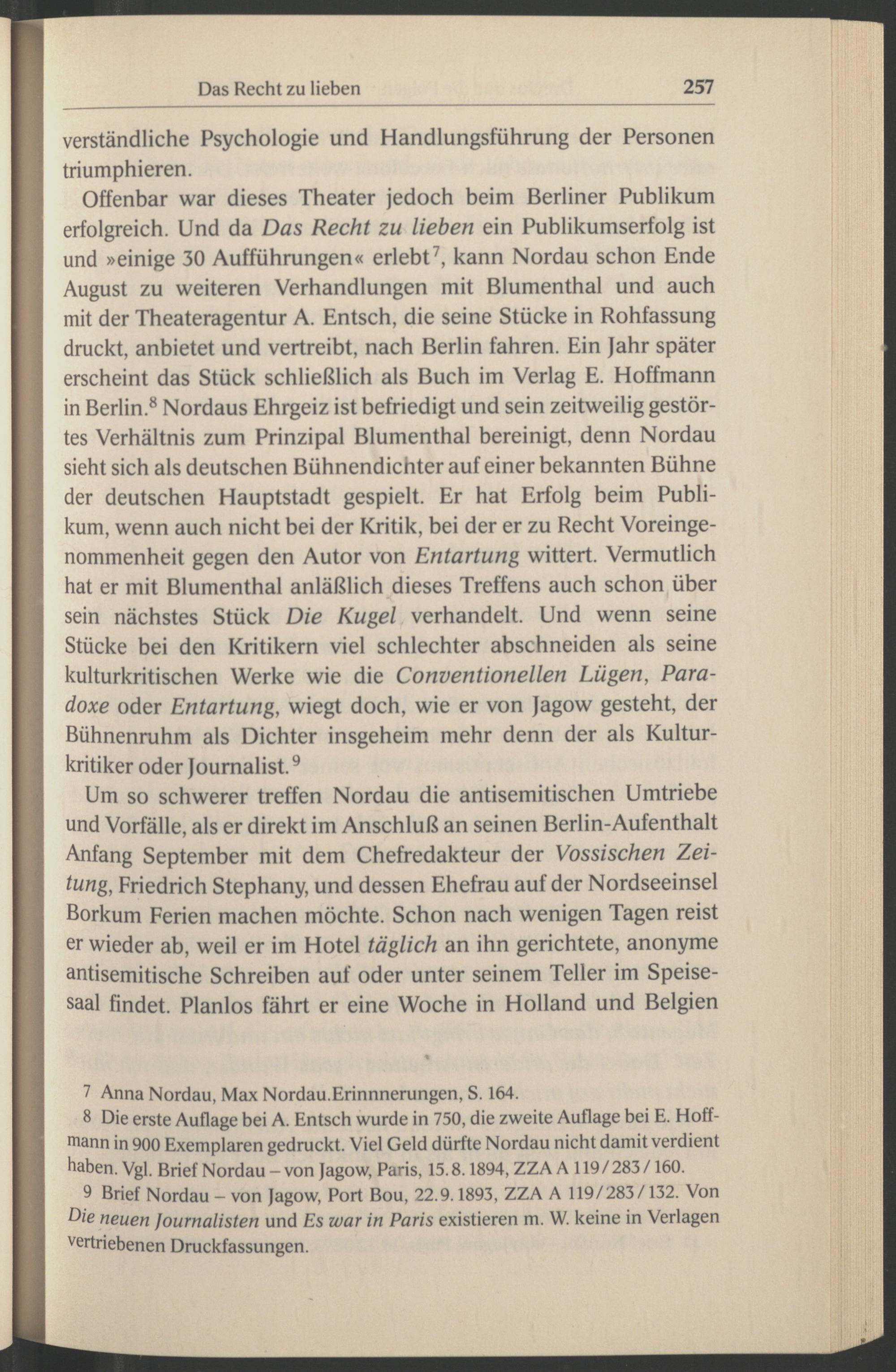 Offenbar war dieses Theater jedoch beim Berliner Publikum erfolgreich. Und da Das Recht zu lieben ein Publikumserfolg ist und »einige 30 Aufführungen« erlebt 7 , kann Nordau schon Ende August zu weiteren Verhandlungen mit Blumenthal und auch mit der Theateragentur A. Entsch, die seine Stücke in Rohfassung druckt, anbietet und vertreibt, nach Berlin fahren. Ein Jahr später erscheint das Stück schließlich als Buch im Verlag E. Hoffmann in Berlin . 8 Nordaus Ehrgeiz ist befriedigt und sein zeitweilig gestörtes Verhältnis zum Prinzipal Blumenthal bereinigt, denn Nordau sieht sich als deutschen Bühnendichter auf einer bekannten Bühne der deutschen Hauptstadt gespielt. Er hat Erfolg beim Publikum, wenn auch nicht bei der Kritik, bei der er zu Recht Voreingenommenheit gegen den Autor von Entartung wittert. Vermutlich hat er mit Blumenthal anläßlich dieses Treffens auch schon über sein nächstes Stück Die Kugel verhandelt. Und wenn seine Stücke bei den Kritikern viel schlechter abschneiden als seine kulturkritischen Werke wie die Conventionellen Lügen, Paradoxe oder Entartung, wiegt doch, wie er von Jagow gesteht, der Bühnenruhm als Dichter insgeheim mehr denn der als Kulturkritiker oder Journalist. 9