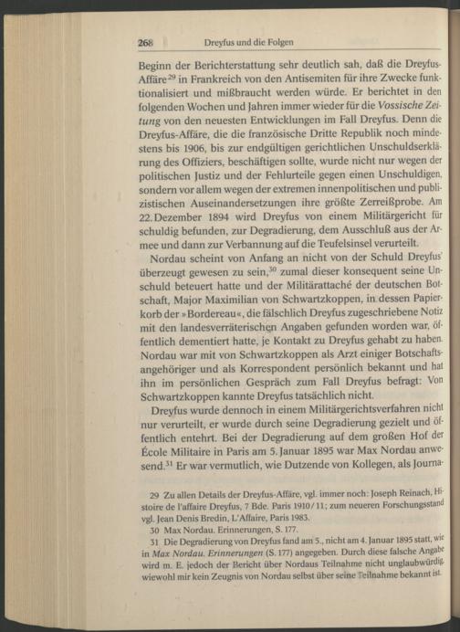 Dreyfus wurde dennoch in einem Militärgerichtsverfahren nicht nur verurteilt, er wurde durch seine Degradierung gezielt und öffentlich entehrt. Bei der Degradierung auf dem großen Hof der £cole Militaire in Paris am 5. Januar 1895 war Max Nordau anwesend. 31 Er war vermutlich, wie Dutzende von Kollegen, als Journa-