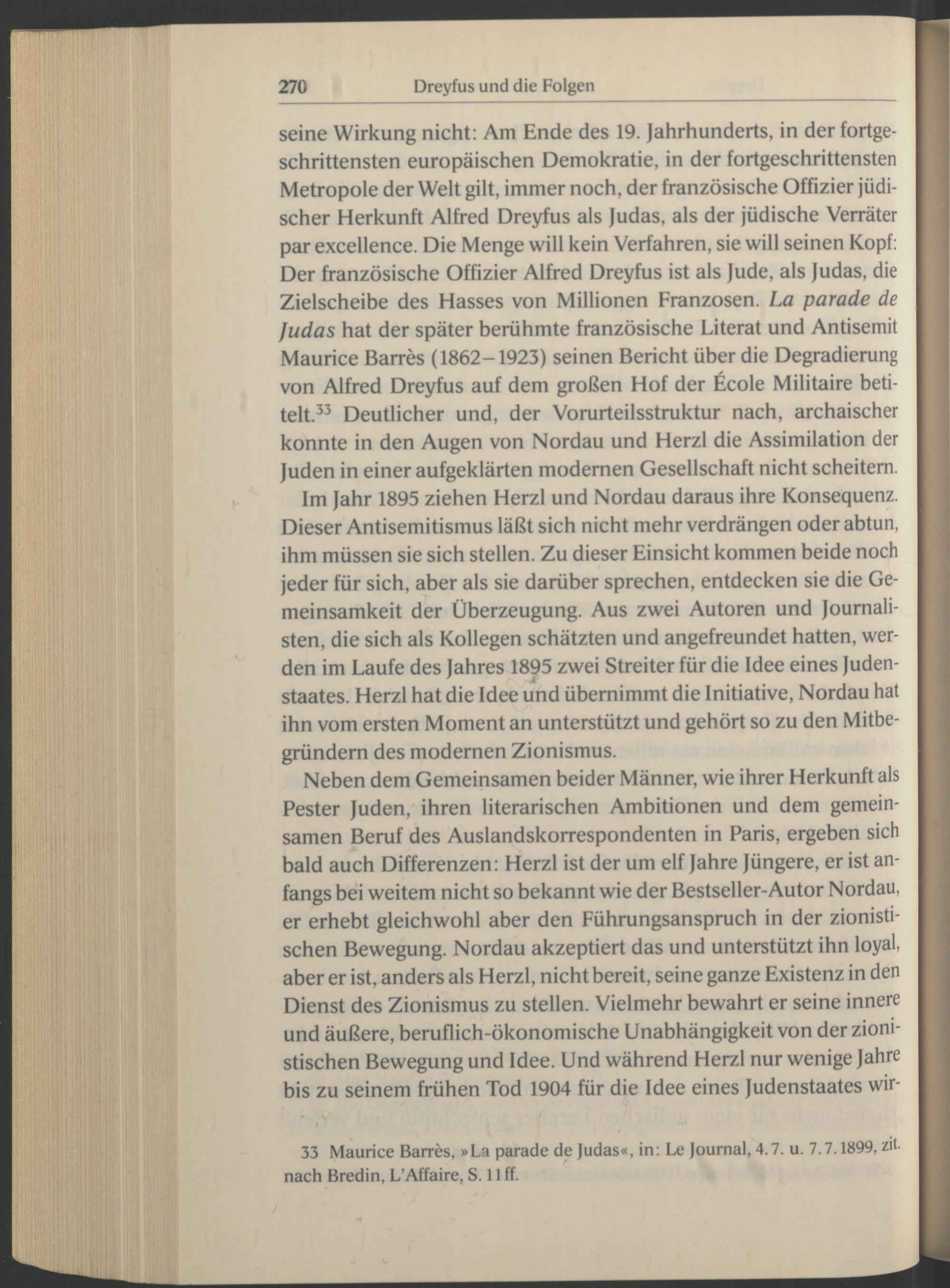 seine Wirkung nicht: Am Ende des 19. Jahrhunderts, in der fortgeschrittensten europäischen Demokratie, in der fortgeschrittensten Metropole der Welt gilt, immer noch, der französische Offizier jüdischer Herkunft Alfred Dreyfus als Judas , als der jüdische Verräter par excellence. Die Menge will kein Verfahren, sie will seinen Kopf: Der französische Offizier Alfred Dreyfus ist als Jude, als Judas , die Zielscheibe des Hasses von Millionen Franzosen . La parade de Judas hat der später berühmte französische Literat und Antisemit Maurice Barres (1862-1923) seinen Bericht über die Degradierung von Alfred Dreyfus auf dem großen Hof der £cole Militaire betitelt. 33 Deutlicher und, der Vorurteilsstruktur nach, archaischer konnte in den Augen von Nordau und Herzl die Assimilation der Juden in einer aufgeklärten modernen Gesellschaft nicht scheitern.