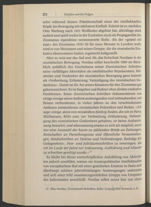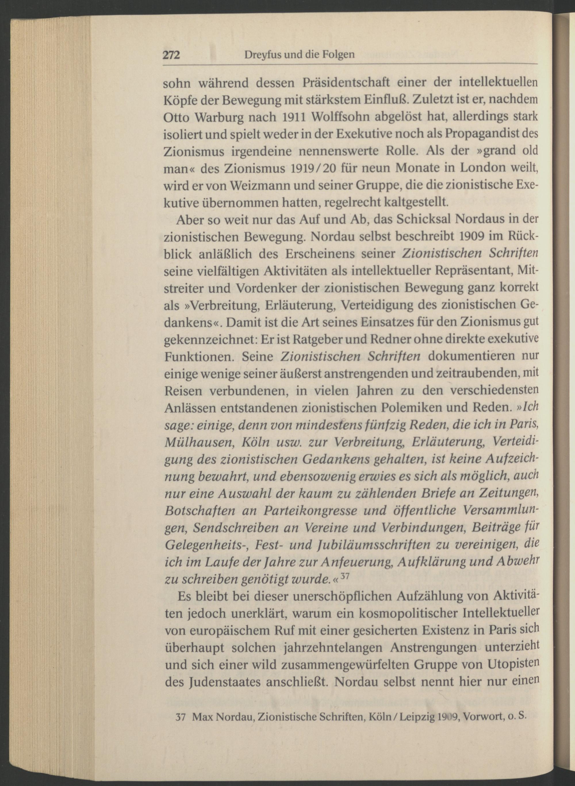 Aber so weit nur das Auf und Ab, das Schicksal Nordaus in der zionistischen Bewegung. Nordau selbst beschreibt 1909 im Rückblick anläßlich des Erscheinens seiner Zionistischen Schriften seine vielfältigen Aktivitäten als intellektueller Repräsentant, Mitstreiter und Vordenker der zionistischen Bewegung ganz korrekt als »Verbreitung, Erläuterung, Verteidigung des zionistischen Gedankens«. Damit ist die Art seines Einsatzes für den Zionismus gut gekennzeichnet: Er ist Ratgeber und Redner ohne direkte exekutive Funktionen. Seine Zionistischen Schriften dokumentieren nur einige wenige seiner äußerst anstrengenden und zeitraubenden, mit Reisen verbundenen, in vielen Jahren zu den verschiedensten Anlässen entstandenen zionistischen Polemiken und Reden. »Ich sage: einige, denn von mindestens fünfzig Reden, die ich in Paris , Mülhausen , Köln usw. zur Verbreitung, Erläuterung, Verteidigung des zionistischen Gedankens gehalten, ist keine Aufzeichnung bewahrt, und ebensowenig erwies es sich als möglich, auch nur eine Auswahl der kaum zu zählenden Briefe an Zeitungen, Botschaften an Parteikongresse und öffentliche Versammlungen, Sendschreiben an Vereine und Verbindungen, Beiträge für Gelegenheits-, Fest- und fubiläumsschriften zu vereinigen, die ich im Laufe der fahre zur Anfeuerung, Aufklärung und Abwehr zu schreiben genötigt wurde .« 37