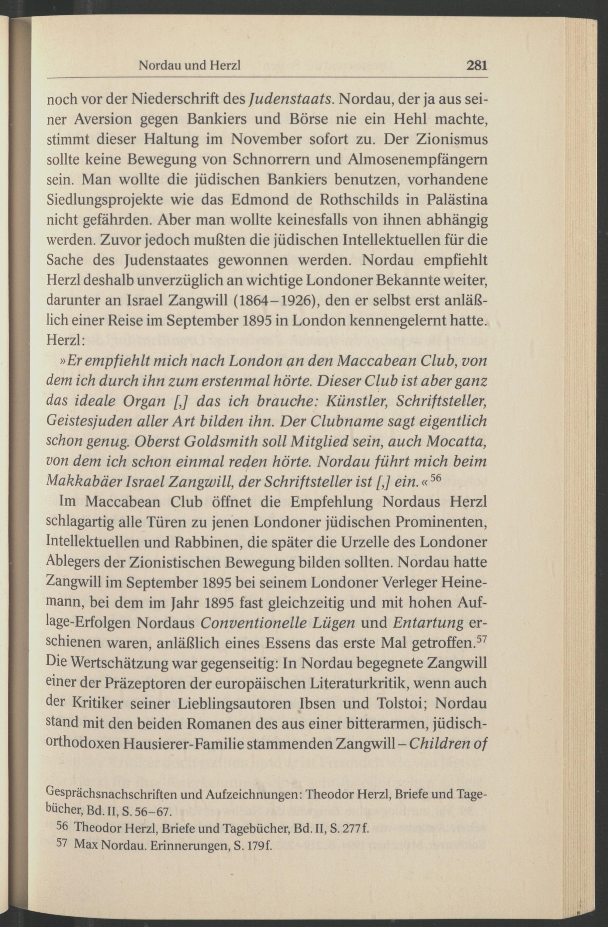 Im Maccabean Club öffnet die Empfehlung Nordaus Herzl schlagartig alle Türen zu jenen Londoner jüdischen Prominenten, Intellektuellen und Rabbinen, die später die Urzelle des Londoner Ablegers der Zionistischen Bewegung bilden sollten. Nordau hatte Zangwill im September 1895 bei seinem Londoner Verleger Heinemann, bei dem im Jahr 1895 fast gleichzeitig und mit hohen Auflage-Erfolgen Nordaus Conventionelle Lügen und Entartung erschienen waren, anläßlich eines Essens das erste Mal getroffen. 57 Die Wertschätzung war gegenseitig: In Nordau begegnete Zangwill einer der Präzeptoren der europäischen Literaturkritik, wenn auch der Kritiker seiner Lieblingsautoren Ibsen und Tolstoi ; Nordau stand mit den beiden Romanen des aus einer bitterarmen, jüdischorthodoxen Hausierer-Familie stammenden Zangwill - Children of
