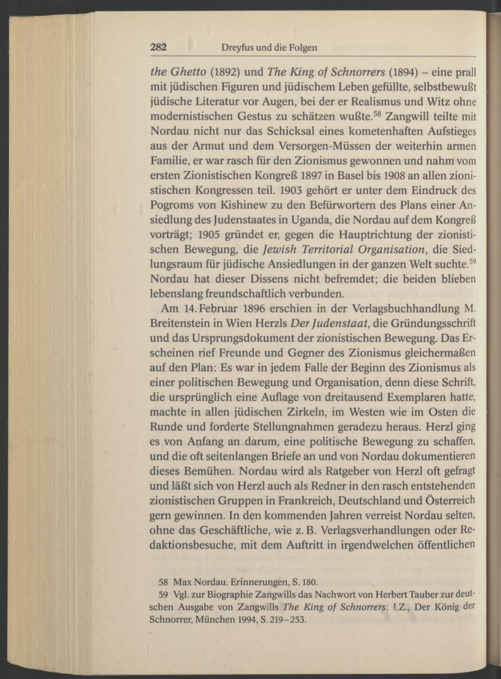 the Ghetto (1892) und The King of Schnorrers (1894) - eine prall mit jüdischen Figuren und jüdischem Leben gefüllte, selbstbewußt jüdische Literatur vor Augen, bei der er Realismus und Witz ohne modernistischen Gestus zu schätzen wußte. 58 Zangwill teilte mit Nordau nicht nur das Schicksal eines kometenhaften Aufstieges aus der Armut und dem Versorgen-Müssen der weiterhin armen Familie, er war rasch für den Zionismus gewonnen und nahm vom ersten Zionistischen Kongreß 1897 in Basel bis 1908 an allen zioni stischen Kongressen teil. 1903 gehört er unter dem Eindruck des Pogroms von Kishinew zu den Befürwortern des Plans einer Ansiedlung des Judenstaates in Uganda , die Nordau auf dem Kongreß vorträgt; 1905 gründet er, gegen die Hauptrichtung der zionisti schen Bewegung, die Jewish Territorial Organisation, die Siedlungsraum für jüdische Ansiedlungen in der ganzen Welt suchte. 59 Nordau hat dieser Dissens nicht befremdet; die beiden blieben lebenslang freundschaftlich verbunden.