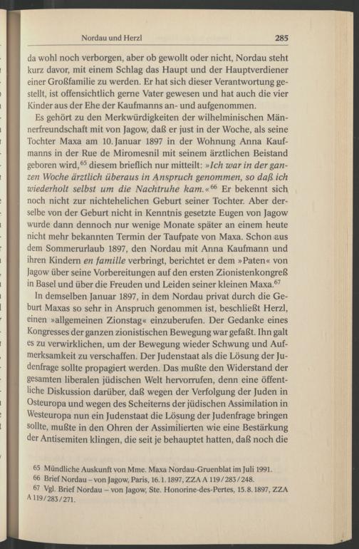 Es gehört zu den Merkwürdigkeiten der wilhelminischen Männerfreundschaft mit von Jagow, daß er just in der Woche, als seine Tochter Maxa am 10. Januar 1897 in der Wohnung Anna Kaufmanns in der Rue de Miromesnil mit seinem ärztlichen Beistand geboren wird, 65 diesem brieflich nur mitteilt: »Ich war in der ganzen Woche ärztlich überaus in Anspruch genommen, so daß ich wiederholt selbst um die Nachtruhe kam.«^ Er bekennt sich noch nicht zur nichtehelichen Geburt seiner Tochter. Aber derselbe von der Geburt nicht in Kenntnis gesetzte Eugen von Jagow wurde dann dennoch nur wenige Monate später an einem heute nicht mehr bekannten Termin der Taufpate von Maxa. Schon aus dem Sommerurlaub 1897, den Nordau mit Anna Kaufmann und ihren Kindern en famille verbringt, berichtet er dem »Paten « von Jagow über seine Vorbereitungen auf den ersten Zionistenkongreß in Basel und über die Freuden und Leiden seiner kleinen Maxa. 67
