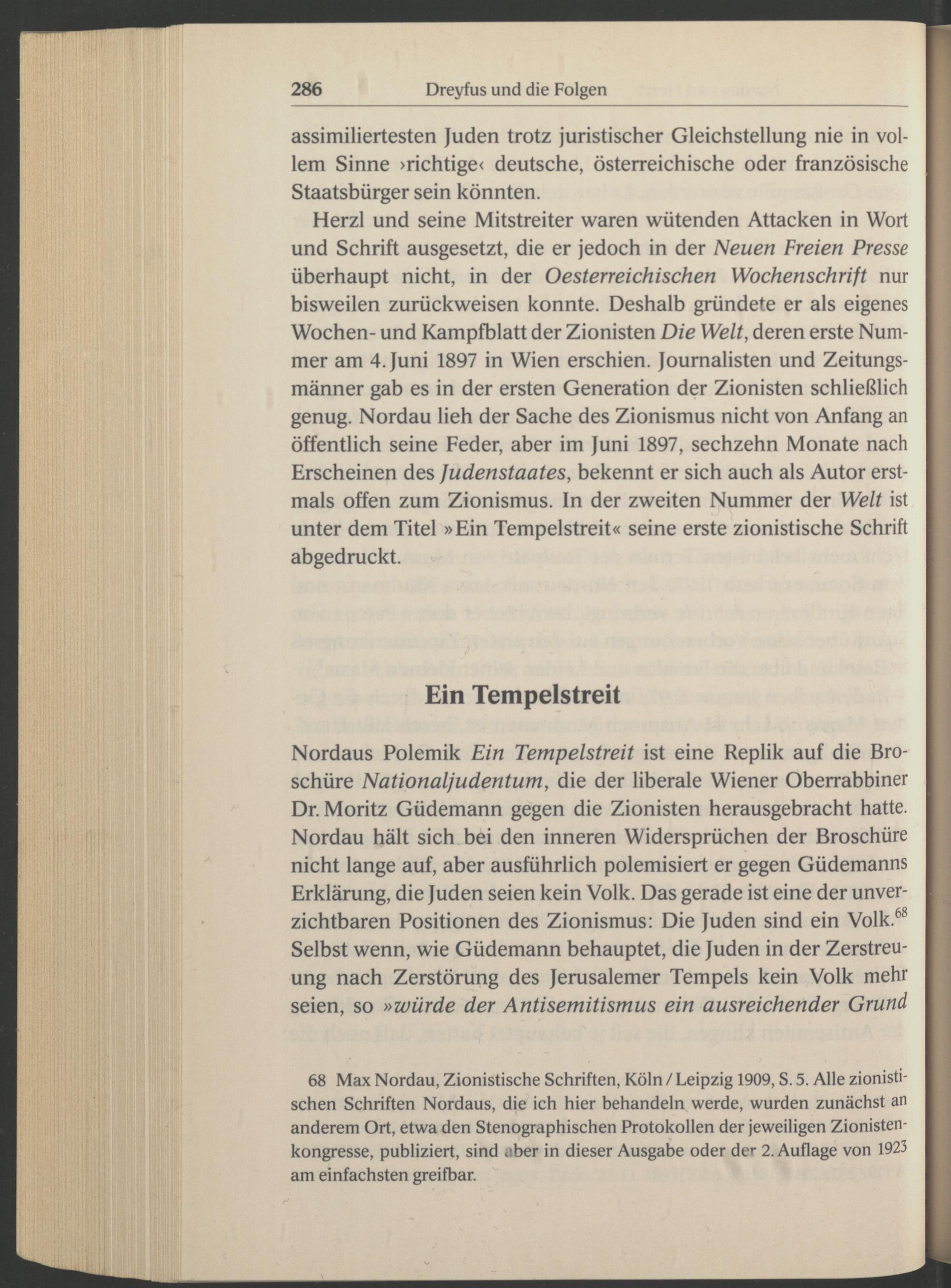 Nordaus Polemik Ein Tempelstreit ist eine Replik auf die Broschüre Nationaljudentum, die der liberale Wiener Oberrabbiner Dr. Moritz Güdemann gegen die Zionisten herausgebracht hatte. Nordau hält sich bei den inneren Widersprüchen der Broschüre nicht lange auf, aber ausführlich polemisiert er gegen Güdemanns Erklärung, die Juden seien kein Volk. Das gerade ist eine der unverzichtbaren Positionen des Zionismus: Die Juden sind ein Volk. 68 Selbst wenn, wie Güdemann behauptet, die Juden in der Zerstreuung nach Zerstörung des Jerusalemer Tempels kein Volk mehr seien, so »würde der Antisemitismus ein ausreichender Grund
