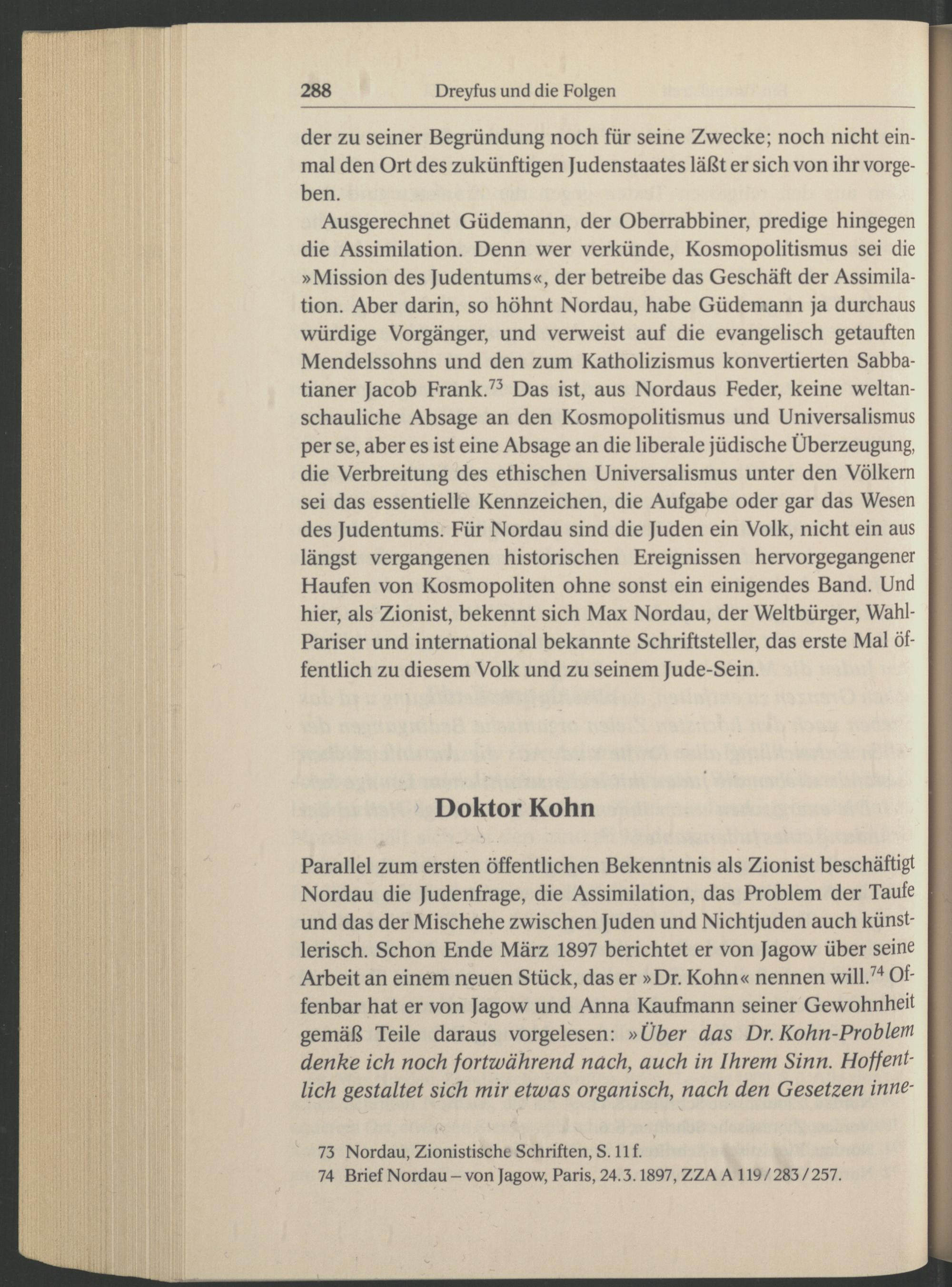 Parallel zum ersten öffentlichen Bekenntnis als Zionist beschäftigt Nordau die Judenfrage, die Assimilation, das Problem der Taufe und das der Mischehe zwischen Juden und Nichtjuden auch künstlerisch. Schon Ende März 1897 berichtet er von Jagow über seine Arbeit an einem neuen Stück, das er »Dr. Kohn« nennen will. 74 Offenbar hat er von Jagow und Anna Kaufmann seiner Gewohnheit gemäß Teile daraus vorgelesen: »Über das Dr. Kohn-Problem denke ich noch fortwährend nach, auch in Ihrem Sinn. Hoffentlich gestaltet sich mir etwas organisch, nach den Gesetzen innere Nordau, Zionistische Schriften, S. 11 f.