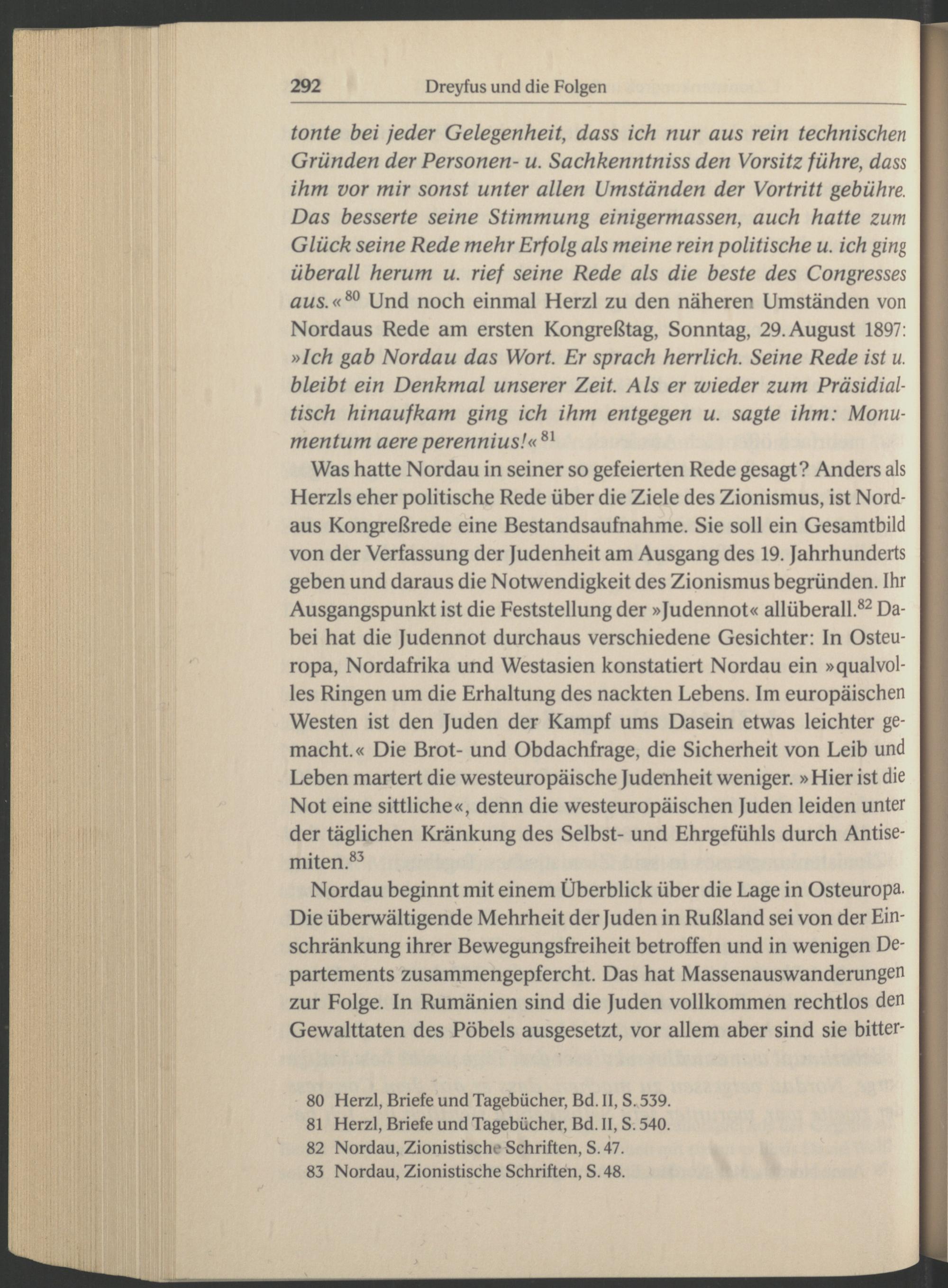 tonte bei jeder Gelegenheit, dass ich nur aus rein technischen Gründen der Personen- u. Sachkenntniss den Vorsitz führe, dass ihm vor mir sonst unter allen Umständen der Vortritt gebühre. Das besserte seine Stimmung einigermassen, auch hatte zum Glück seine Rede mehr Erfolg als meine rein politische u. ich ging überall herum u. rief seine Rede als die beste des Congresses aus.« 80 Und noch einmal Herzl zu den näheren Umständen von Nordaus Rede am ersten Kongreßtag, Sonntag, 29. August 1897: »Ich gab Nordau das Wort. Er sprach herrlich. Seine Rede ist u. bleibt ein Denkmal unserer Zeit. Als er wieder zum Präsidialtisch hinauf kam ging ich ihm entgegen u. sagte ihm: Monu- mentum aere perennius!« 81
