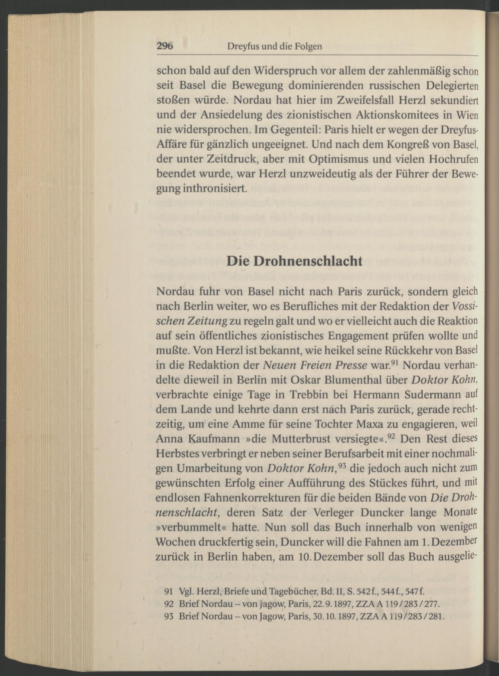 Nordau fuhr von Basel nicht nach Paris zurück, sondern gleich nach Berlin weiter, wo es Berufliches mit der Redaktion der Vossi- schert Zeitung zu regeln galt und wo er vielleicht auch die Reaktion auf sein öffentliches zionistisches Engagement prüfen wollte und mußte. Von Herzl ist bekannt, wie heikel seine Rückkehr von Basel in die Redaktion der Neuen Freien Presse war. 91 Nordau verhandelte dieweil in Berlin mit Oskar Blumenthal über Doktor Kohn, verbrachte einige Tage in Trebbin bei Hermann Sudermann auf dem Lande und kehrte dann erst nach Paris zurück, gerade rechtzeitig, um eine Amme für seine Tochter Maxa zu engagieren, weil Anna Kaufmann »die Mutterbrust versiegte«. 92 Den Rest dieses Herbstes verbringt er neben seiner Berufsarbeit mit einer nochmaligen Umarbeitung von Doktor Kohn, 9Z die jedoch auch nicht zum gewünschten Erfolg einer Aufführung des Stückes führt, und mit endlosen Fahnenkorrekturen für die beiden Bände von Die Drohnenschlacht, deren Satz der Verleger Duncker lange Monate »verbummelt« hatte. Nun soll das Buch innerhalb von wenigen Wochen druckfertig sein, Duncker will die Fahnen am 1 . Dezember zurück in Berlin haben, am 10. Dezember soll das Buch ausgelie-
