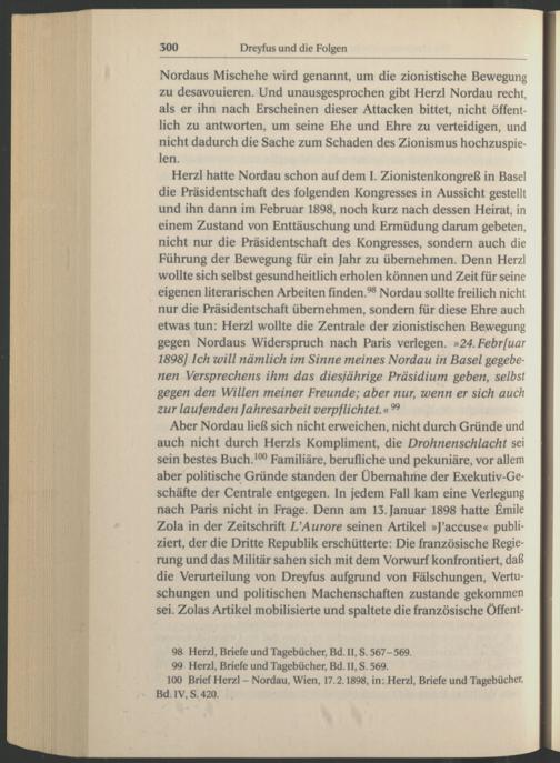 Aber Nordau ließ sich nicht erweichen, nicht durch Gründe und auch nicht durch Herzls Kompliment, die Drohnenschlacht sei sein bestes Buch. 100 Familiäre, berufliche und pekuniäre, vor allem aber politische Gründe standen der Übernahme der Exekutiv-Ge- schäfte der Centrale entgegen. In jedem Fall kam eine Verlegung nach Paris nicht in Frage. Denn am 13. Januar 1898 hatte £mile Zola in der Zeitschrift L’Aurore seinen Artikel »J’accuse « publiziert, der die Dritte Republik erschütterte: Die französische Regierung und das Militär sahen sich mit dem Vorwurf konfrontiert, daß die Verurteilung von Dreyfus aufgrund von Fälschungen, Vertuschungen und politischen Machenschaften zustande gekommen sei. Zolas Artikel mobilisierte und spaltete die französische Öffent-