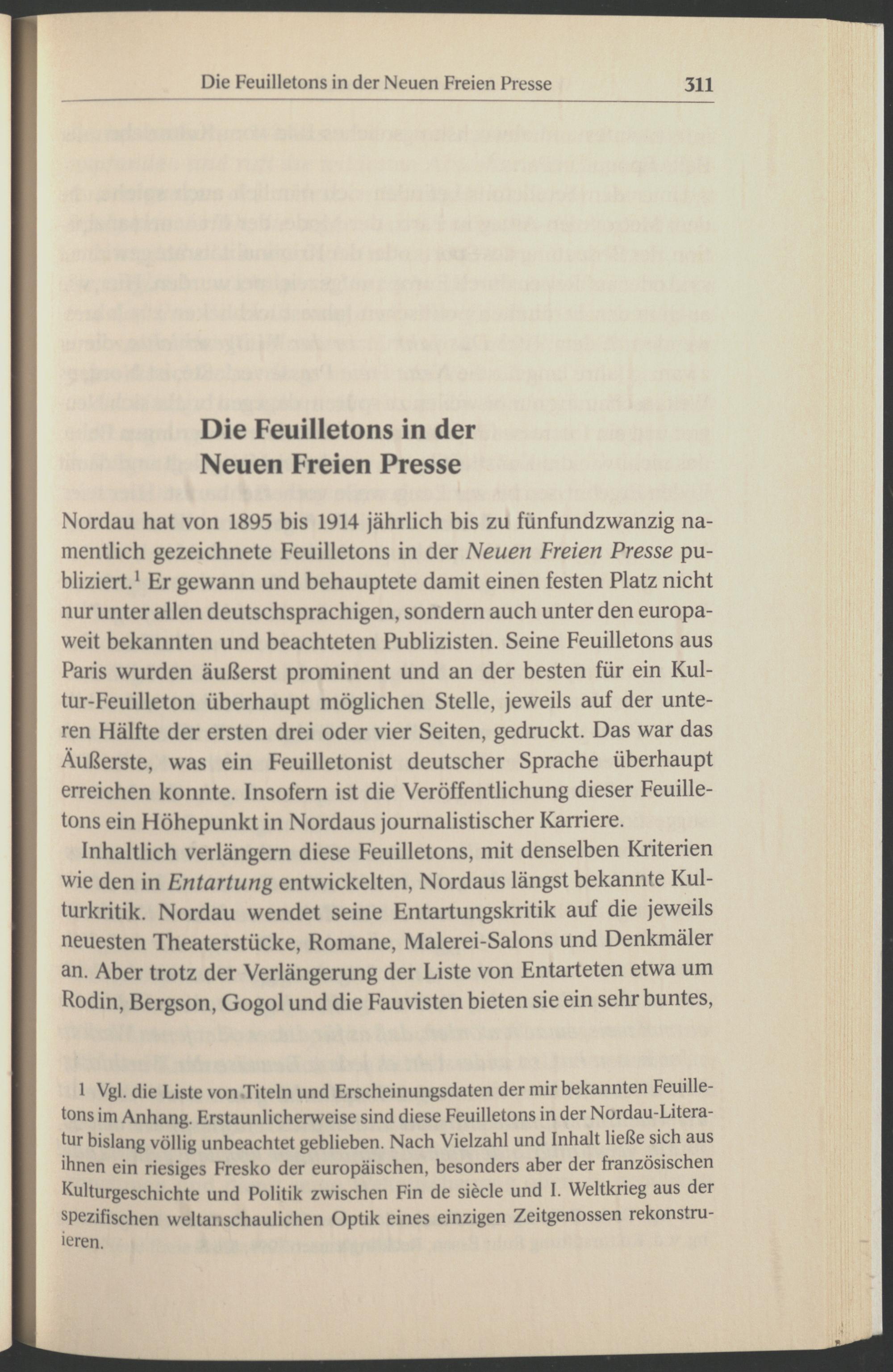 Nordau hat von 1895 bis 1914 jährlich bis zu fünfundzwanzig namentlich gezeichnete Feuilletons in der Neuen Freien Presse publiziert. 1 Er gewann und behauptete damit einen festen Platz nicht nur unter allen deutschsprachigen, sondern auch unter den europaweit bekannten und beachteten Publizisten. Seine Feuilletons aus Paris wurden äußerst prominent und an der besten für ein Kultur-Feuilleton überhaupt möglichen Stelle, jeweils auf der unteren Hälfte der ersten drei oder vier Seiten, gedruckt. Das war das Äußerste, was ein Feuilletonist deutscher Sprache überhaupt erreichen konnte. Insofern ist die Veröffentlichung dieser Feuilletons ein Höhepunkt in Nordaus journalistischer Karriere.