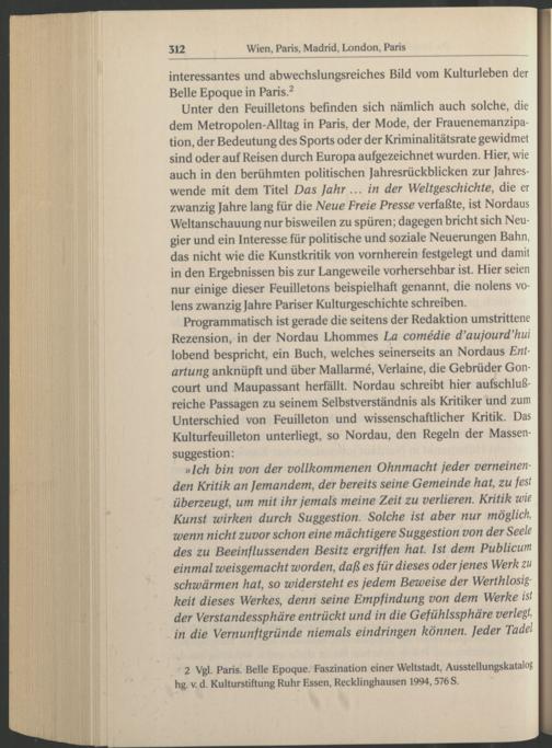 Programmatisch ist gerade die seitens der Redaktion umstrittene Rezension, in der Nordau Lhommes La comedie d’aujourd’hui lobend bespricht, ein Buch, welches seinerseits an Nordaus Entartung anknüpft und über Mallarme, Verlaine , die Gebrüder Goncourt und Maupassant herfällt. Nordau schreibt hier aufschlußreiche Passagen zu seinem Selbstverständnis als Kritiker und zum Unterschied von Feuilleton und wissenschaftlicher Kritik. Das Kulturfeuilleton unterliegt, so Nordau , den Regeln der Massensuggestion: