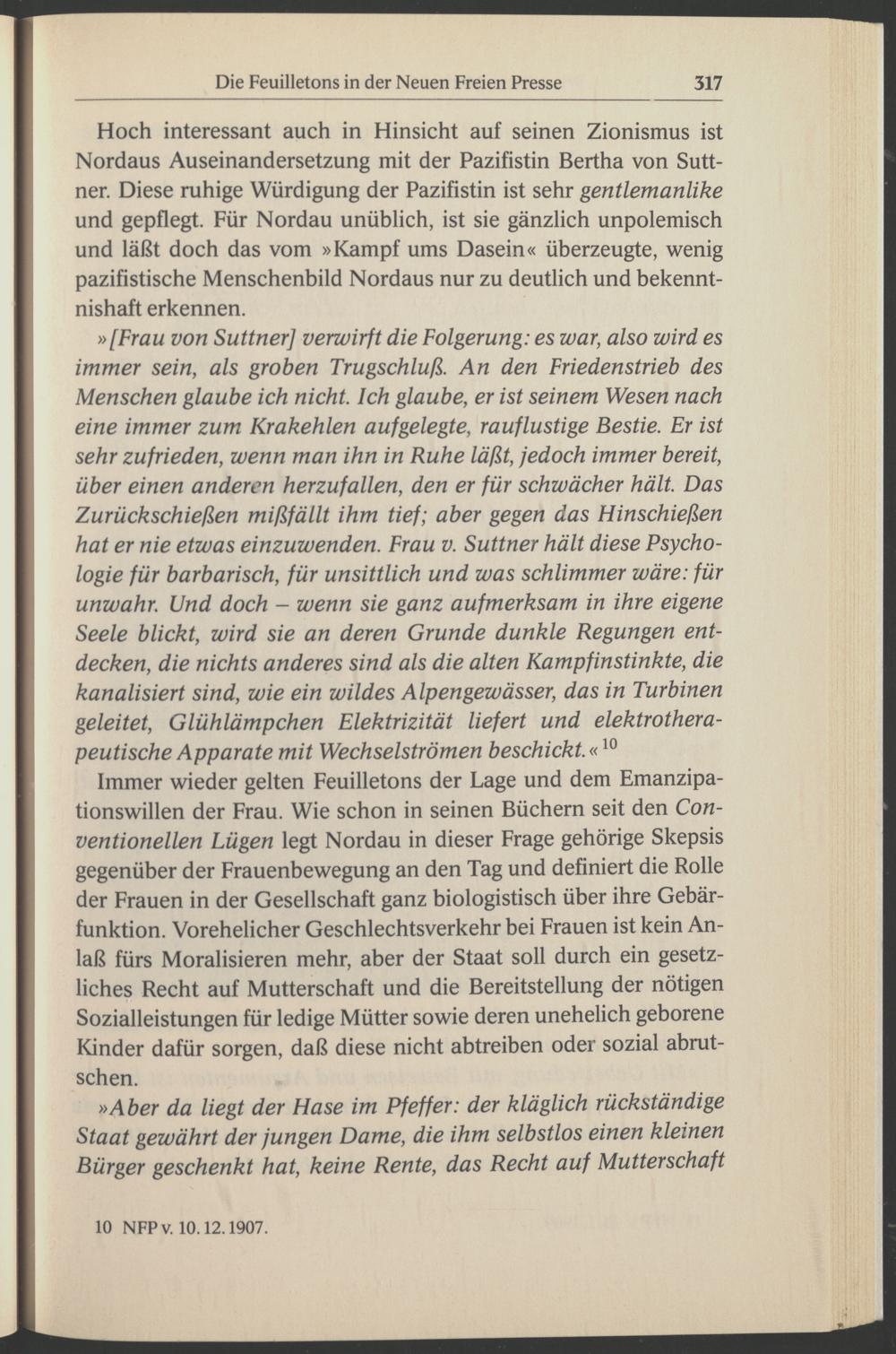 Hoch interessant auch in Hinsicht auf seinen Zionismus ist Nordaus Auseinandersetzung mit der Pazifistin Bertha von Sutt ner . Diese ruhige Würdigung der Pazifistin ist sehr gentlemanlike und gepflegt. Für Nordau unüblich, ist sie gänzlich unpolemisch und läßt doch das vom »Kampf ums Dasein« überzeugte, wenig pazifistische Menschenbild Nordaus nur zu deutlich und bekenntnishaft erkennen.