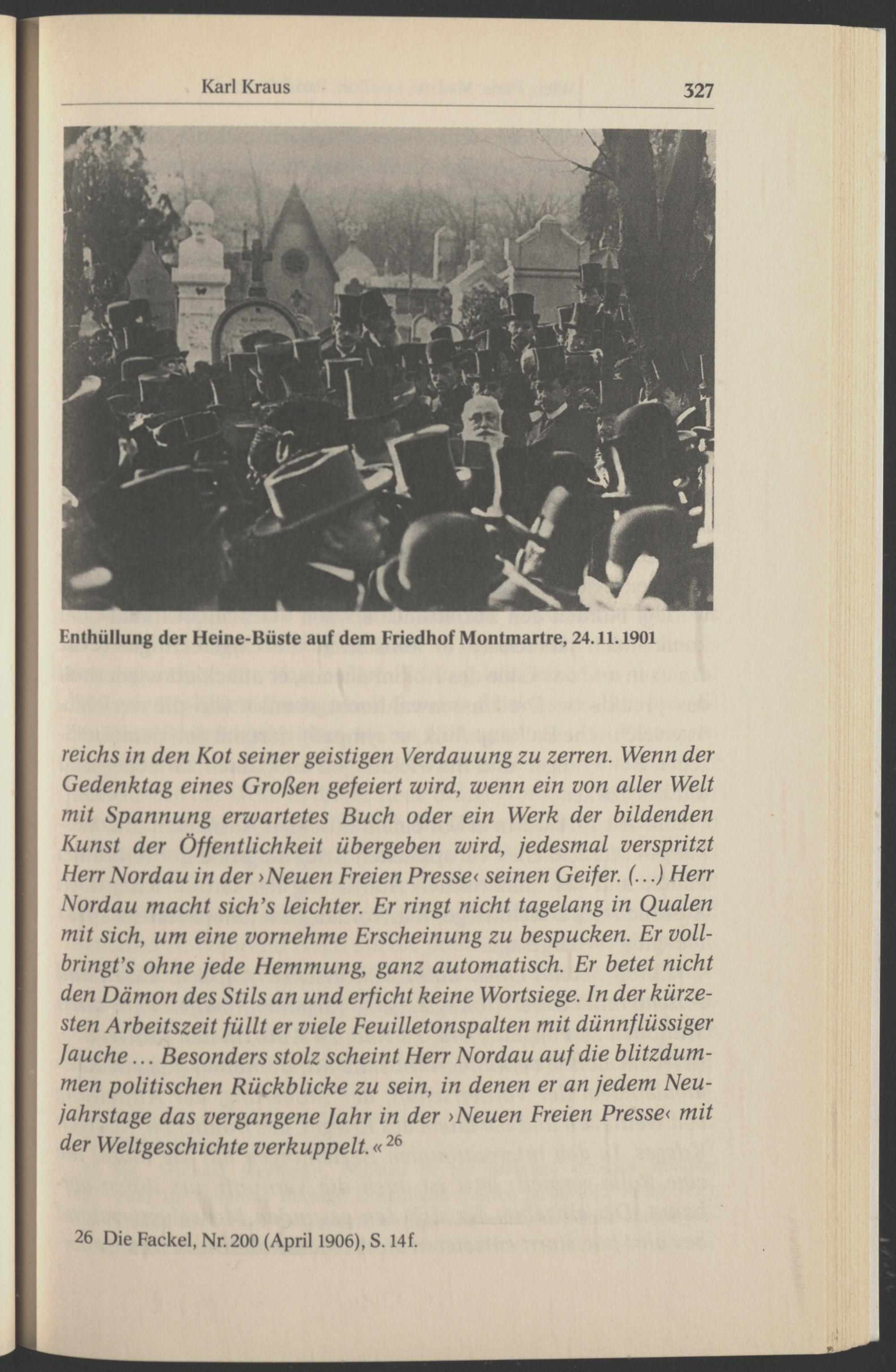 reichs in den Kot seiner geistigen Verdauung zu zerren. Wenn der Gedenktag eines Großen gefeiert wird, wenn ein von aller Welt mit Spannung erwartetes Buch oder ein Werk der bildenden Kunst der Öffentlichkeit übergeben wird, jedesmal verspritzt Herr Nordau in der >Neuen Freien Presse< seinen Geifer. (...) Herr Nordau macht sich’s leichter. Er ringt nicht tagelang in Qualen mit sich, um eine vornehme Erscheinung zu bespucken. Er voll- bringt’s ohne jede Hemmung, ganz automatisch. Er betet nicht den Dämon des Stils an und erficht keine Wortsiege. In der kürzesten Arbeitszeit füllt er viele Feuilletonspalten mit dünnflüssiger fauche... Besonders stolz scheint Herr Nordau auf die blitzdummen politischen Rückblicke zu sein, in denen er an jedem Neujahrstage das vergangene fahr in der >Neuen Freien Presse< mit der Weltgeschichte verkuppelt.« 26