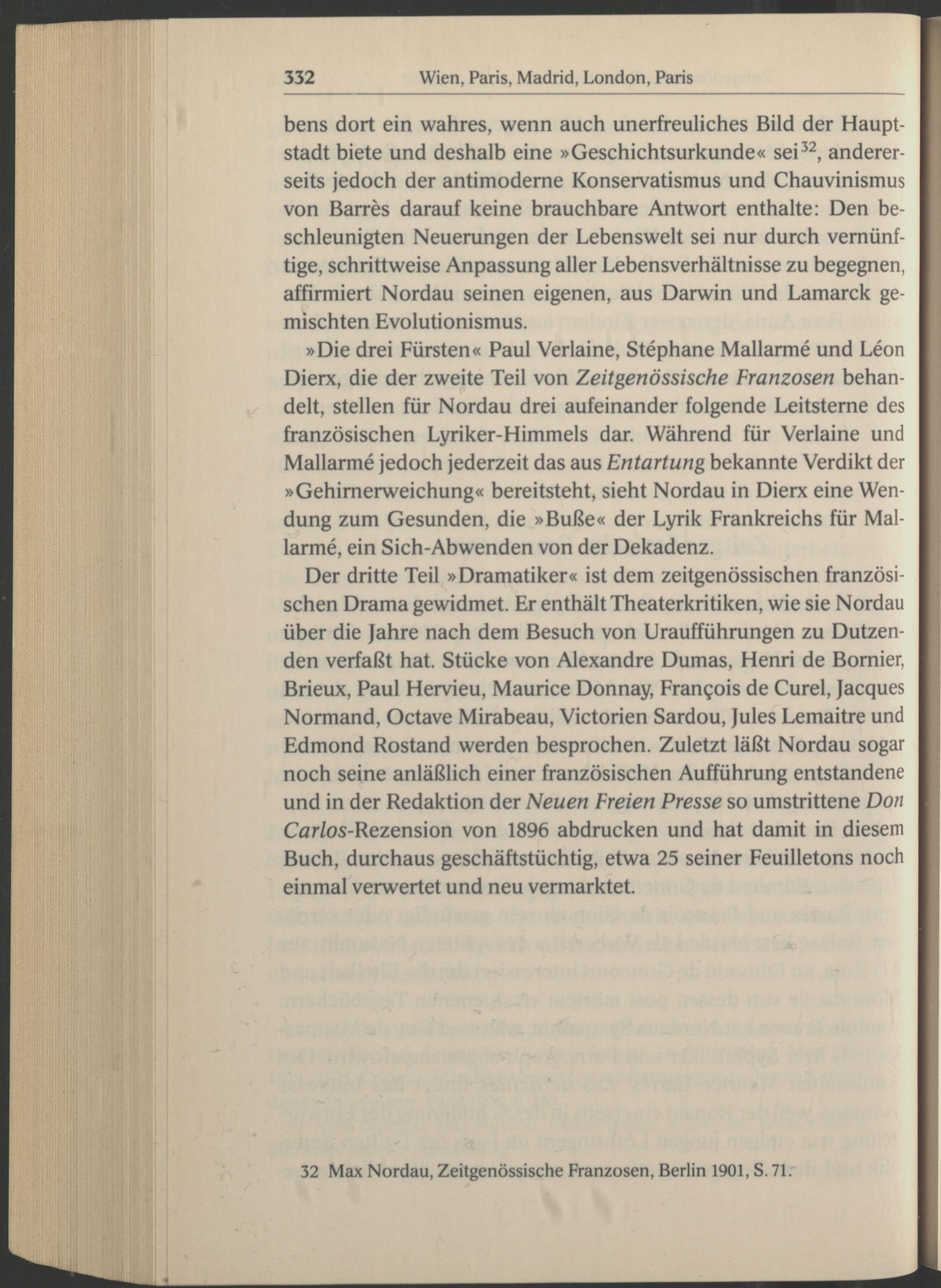 bens dort ein wahres, wenn auch unerfreuliches Bild der Hauptstadt biete und deshalb eine »Geschichtsurkunde« sei 32 , andererseits jedoch der antimodeme Konservatismus und Chauvinismus von Barres darauf keine brauchbare Antwort enthalte: Den beschleunigten Neuerungen der Lebenswelt sei nur durch vernünftige, schrittweise Anpassung aller Lebensverhältnisse zu begegnen, affirmiert Nordau seinen eigenen, aus Darwin und Lamarck gemischten Evolutionismus.