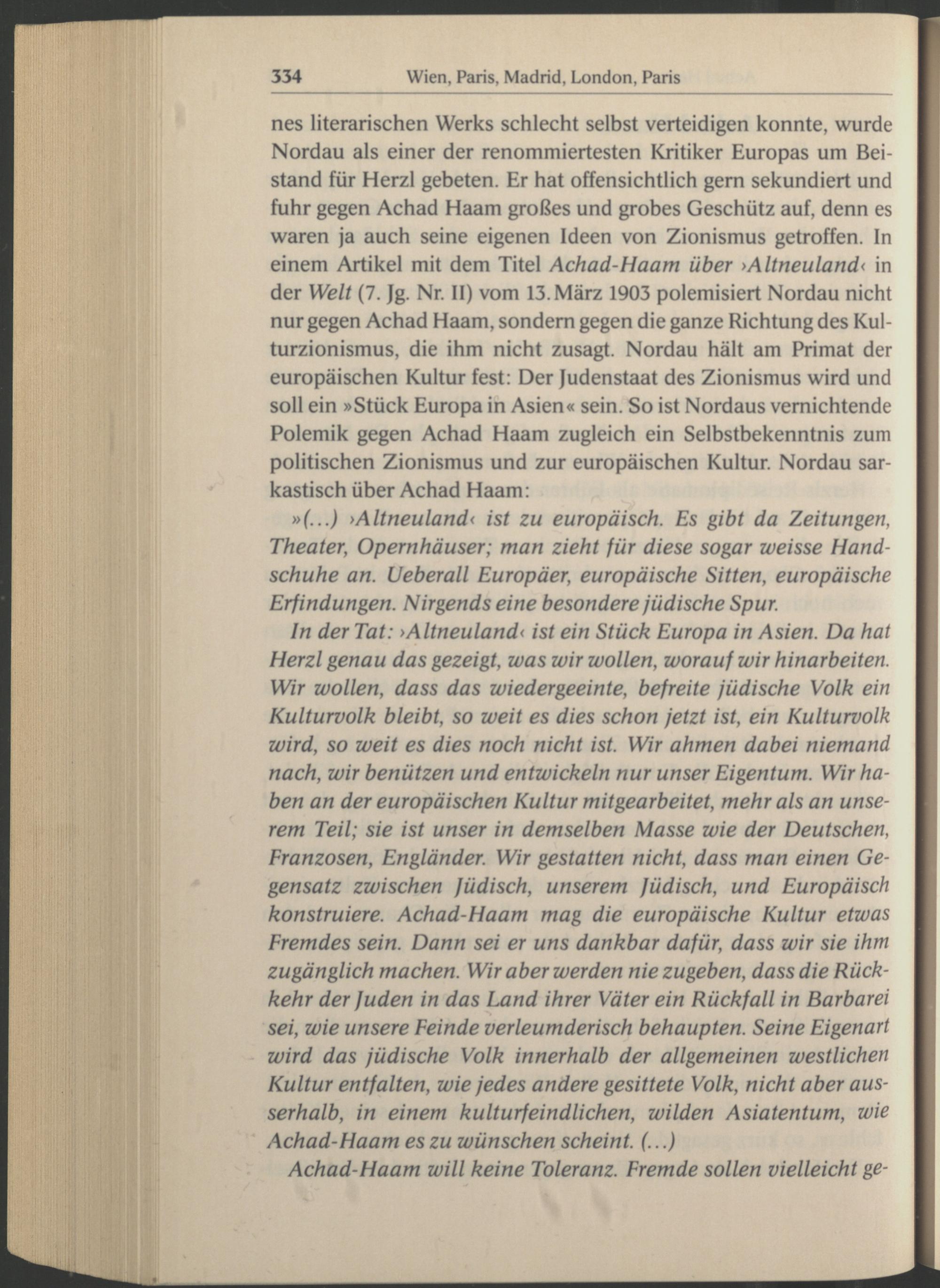 nes literarischen Werks schlecht selbst verteidigen konnte, wurde Nordau als einer der renommiertesten Kritiker Europas um Beistand für Herzl gebeten. Er hat offensichtlich gern sekundiert und fuhr gegen Achad Haam großes und grobes Geschütz auf, denn es waren ja auch seine eigenen Ideen von Zionismus getroffen, ln einem Artikel mit dem Titel Achad-Haam über >Altneuland< in der Welt (7. Jg. Nr. II) vom 13. März 1903 polemisiert Nordau nicht nur gegen Achad Haam , sondern gegen die ganze Richtung des Kulturzionismus, die ihm nicht zusagt. Nordau hält am Primat der europäischen Kultur fest: Der judenstaat des Zionismus wird und soll ein »Stück Europa in Asien « sein. So ist Nordaus vernichtende Polemik gegen Achad Haam zugleich ein Selbstbekenntnis zum politischen Zionismus und zur europäischen Kultur. Nordau sarkastisch über Achad Haam :