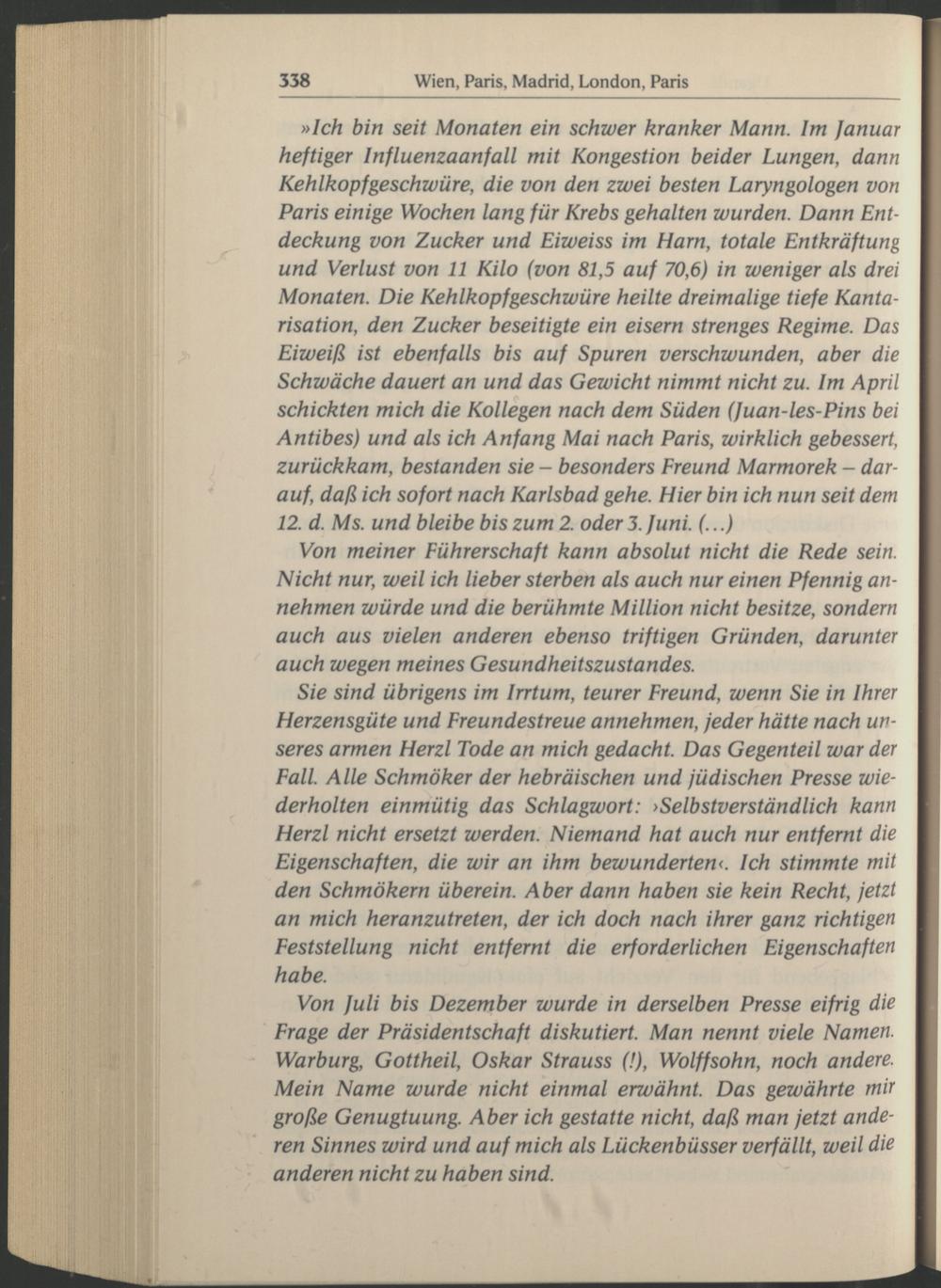 Von Juli bis Dezember wurde in derselben Presse eifrig die Frage der Präsidentschaft diskutiert. Man nennt viele Namen. Warburg , Gottheil, Oskar Strauss (!), Wolffsohn , noch andere. Mein Name wurde nicht einmal erwähnt. Das gewährte mir große Genugtuung. Aber ich gestatte nicht, daß man jetzt anderen Sinnes wird und auf mich als Lückenbüsser verfällt, weil die anderen nicht zu haben sind.