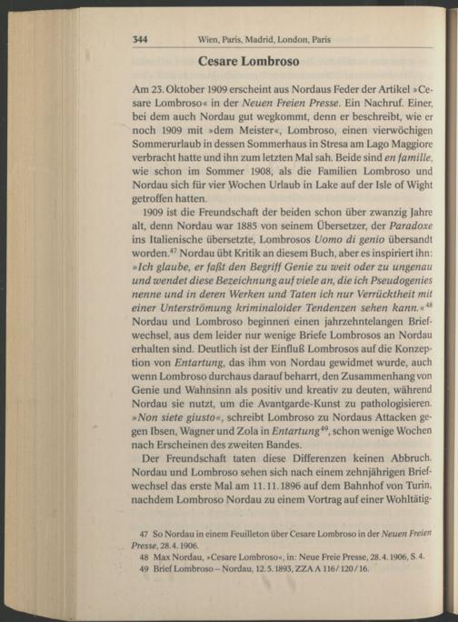1909 ist die Freundschaft der beiden schon über zwanzig Jahre alt, denn Nordau war 1885 von seinem Übersetzer, der Paradoxe ins Italienische übersetzte, Lombrosos Uomo di genio übersandt worden. 47 Nordau übt Kritik an diesem Buch, aber es inspiriert ihn: »Ich glaube, er faßt den Begriff Genie zu weit oder zu ungenau und wendet diese Bezeichnung auf viele an, die ich Pseudogenies nenne und in deren Werken und Taten ich nur Verrücktheit mit einer Unterströmung kriminaloider Tendenzen sehen kann.«** Nordau und Lombroso beginnen einen jahrzehntelangen Briefwechsel, aus dem leider nur wenige Briefe Lombrosos an Nordau erhalten sind. Deutlich ist der Einfluß Lombrosos auf die Konzeption von Entartung, das ihm von Nordau gewidmet wurde, auch wenn Lombroso durchaus darauf beharrt, den Zusammenhang von Genie und Wahnsinn als positiv und kreativ zu deuten, während Nordau sie nutzt, um die Avantgarde-Kunst zu pathologisieren. »Non siete giusto«, schreibt Lombroso zu Nordaus Attacken gegen Ibsen, Wagner und Zola in Entartung 49 , schon wenige Wochen nach Erscheinen des zweiten Bandes.