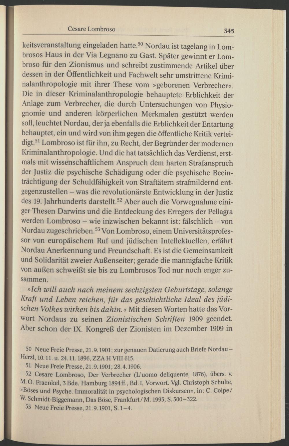 keitsveranstaltung eingeladen hatte. 50 Nordau ist tagelang in Lom- brosos Haus in der Via Legnano zu Gast. Später gewinnt er Lom broso für den Zionismus und schreibt zustimmende Artikel über dessen in der Öffentlichkeit und Fachwelt sehr umstrittene Kriminalanthropologie mit ihrer These vom »geborenen Verbrecher«. Die in dieser Kriminalanthropologie behauptete Erblichkeit der Anlage zum Verbrecher, die durch Untersuchungen von Physiognomie und anderen körperlichen Merkmalen gestützt werden soll, leuchtet Nordau , der ja ebenfalls die Erblichkeit der Entartung behauptet, ein und wird von ihm gegen die öffentliche Kritik verteidigt. 51 Lombroso ist für ihn, zu Recht, der Begründer der modernen Kriminalanthropologie. Und die hat tatsächlich das Verdienst, erstmals mit wissenschaftlichem Anspruch dem harten Strafanspruch der Justiz die psychische Schädigung oder die psychische Beeinträchtigung der Schuldfähigkeit von Straftätern strafmildernd entgegenzustellen - was die revolutionärste Entwicklung in der Justiz des 19. Jahrhunderts darstellt. 52 Aber auch die Vorwegnahme einiger Thesen Darwins und die Entdeckung des Erregers der Pellagra werden Lombroso - wie inzwischen bekannt ist: fälschlich - von Nordau zugeschrieben. 53 Von Lombroso , einem Universitätsprofessor von europäischem Ruf und jüdischen Intellektuellen, erfährt Nordau Anerkennung und Freundschaft. Es ist die Gemeinsamkeit und Solidarität zweier Außenseiter; gerade die mannigfache Kritik von außen schweißt sie bis zu Lombrosos Tod nur noch enger zusammen.