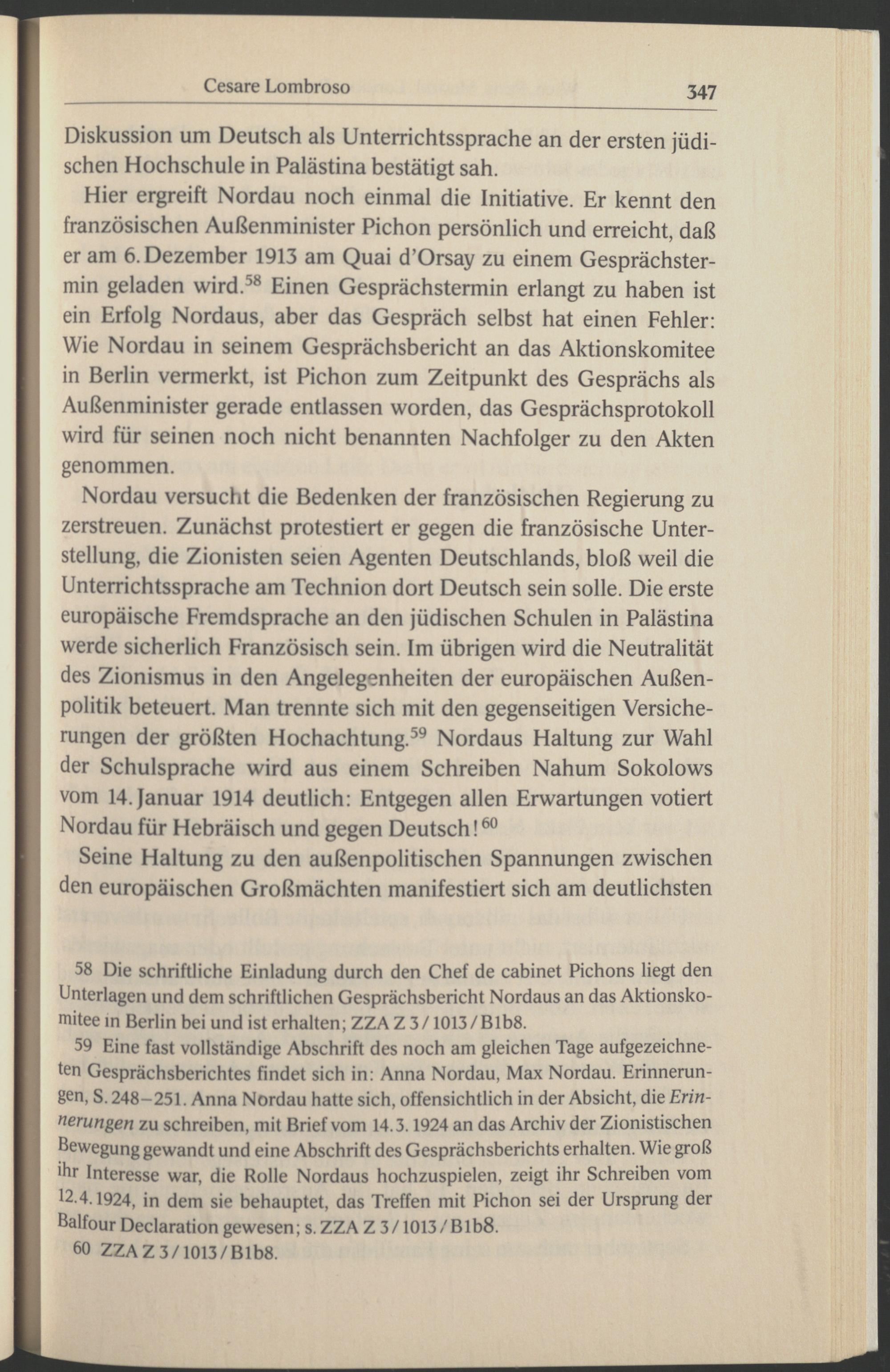 Hier ergreift Nordau noch einmal die Initiative. Er kennt den französischen Außenminister Pichon persönlich und erreicht, daß er am 6. Dezember 1913 am Quai d’Orsay zu einem Gesprächstermin geladen wird. 58 Einen Gesprächstermin erlangt zu haben ist ein Erfolg Nordaus, aber das Gespräch selbst hat einen Fehler: Wie Nordau in seinem Gesprächsbericht an das Aktionskomitee in Berlin vermerkt, ist Pichon zum Zeitpunkt des Gesprächs als Außenminister gerade entlassen worden, das Gesprächsprotokoll wird für seinen noch nicht benannten Nachfolger zu den Akten genommen.