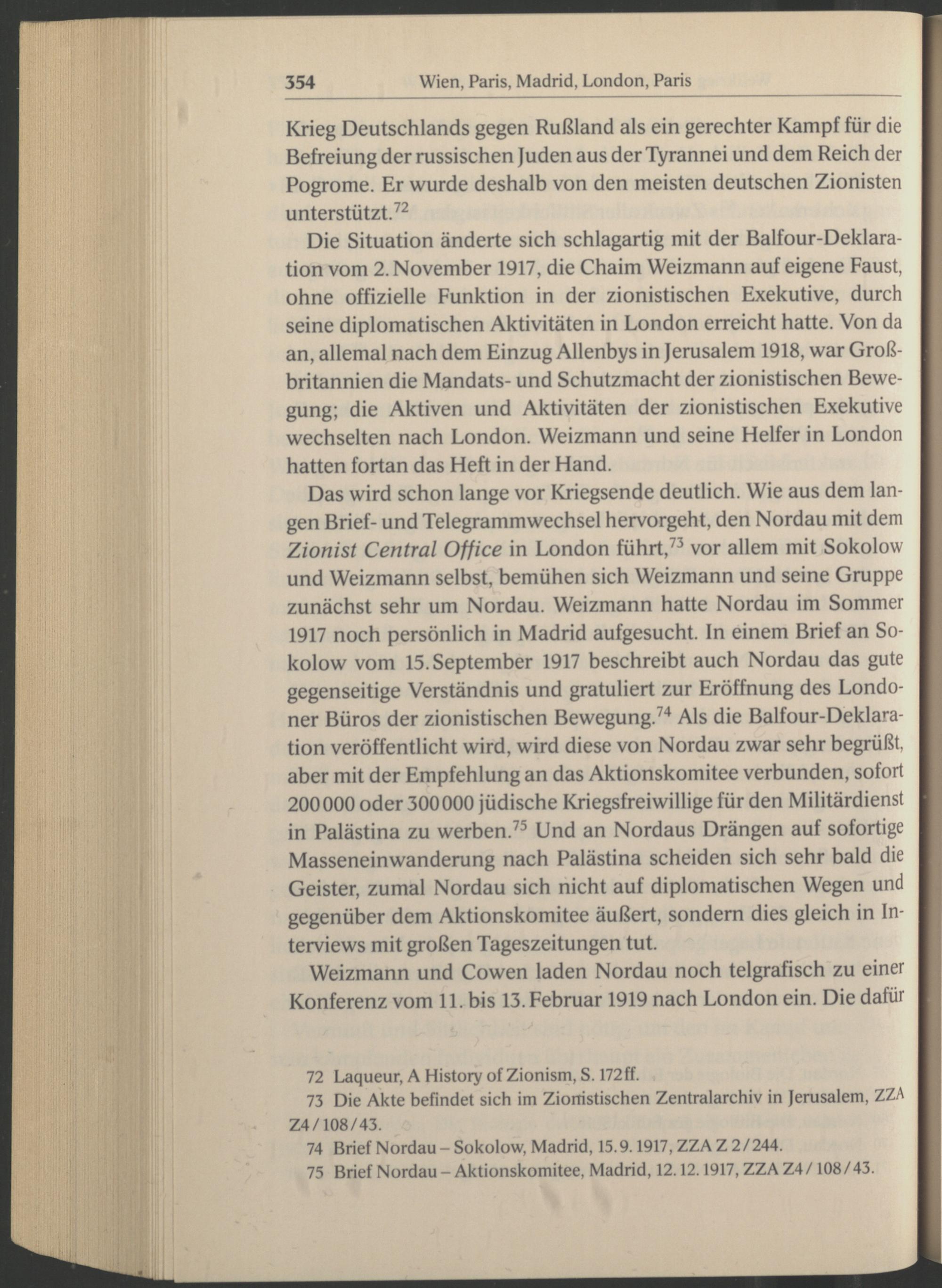 Das wird schon lange vor Kriegsende deutlich. Wie aus dem langen Brief- und Telegrammwechsel hervorgeht, den Nordau mit dem Zionist Central Office in London führt, 73 vor allem mit Sokolow und Weizmann selbst, bemühen sich Weizmann und seine Gruppe zunächst sehr um Nordau. Weizmann hatte Nordau im Sommer 1917 noch persönlich in Madrid aufgesucht, ln einem Brief an Sokolow vom 15. September 1917 beschreibt auch Nordau das gute gegenseitige Verständnis und gratuliert zur Eröffnung des Londo ner Büros der zionistischen Bewegung. 74 Als die Balfour-Deklara tion veröffentlicht wird, wird diese von Nordau zwar sehr begrüßt, aber mit der Empfehlung an das Aktionskomitee verbunden, sofort 200000 oder 300000 jüdische Kriegsfreiwillige für den Militärdienst in Palästina zu werben. 75 Und an Nordaus Drängen auf sofortige Masseneinwanderung nach Palästina scheiden sich sehr bald die Geister, zumal Nordau sich nicht auf diplomatischen Wegen und gegenüber dem Aktionskomitee äußert, sondern dies gleich in Interviews mit großen Tageszeitungen tut.