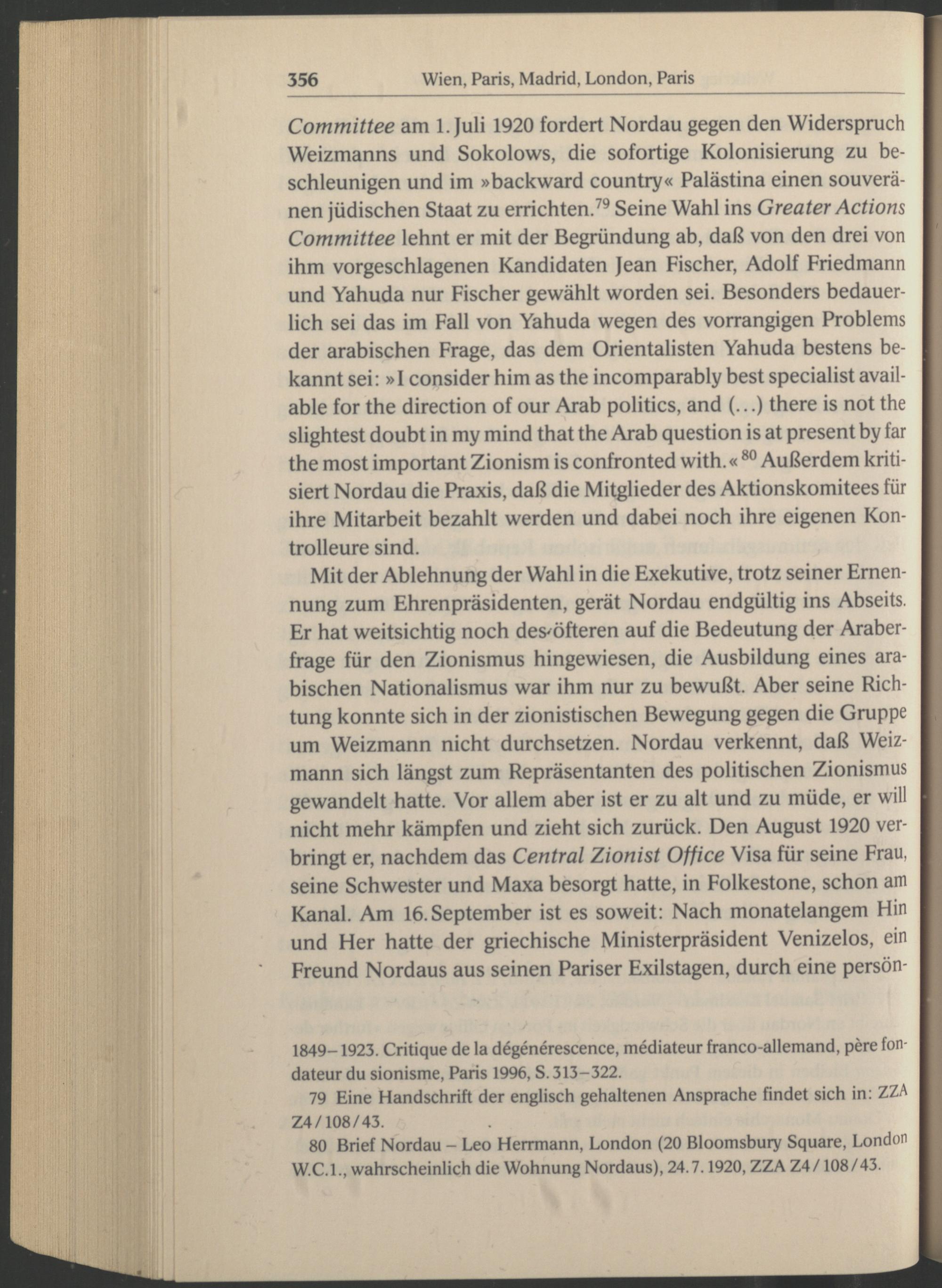 Committee am 1. Juli 1920 fordert Nordau gegen den Widerspruch Weizmanns und Sokolows, die sofortige Kolonisierung zu beschleunigen und im »backward country« Palästina einen souveränen jüdischen Staat zu errichten. 79 Seine Wahl ins Greater Actions Committee lehnt er mit der Begründung ab, daß von den drei von ihm vorgeschlagenen Kandidaten Jean Fischer, Adolf Friedmann und Yahuda nur Fischer gewählt worden sei. Besonders bedauer lieh sei das im Fall von Yahuda wegen des vorrangigen Problems der arabischen Frage, das dem Orientalisten Yahuda bestens bekannt sei: »I consider him as the incomparably best specialist avail- able for the direction of our Arab politics, and (...) there is not the slightest doubt in my mind that the Arab question is at present by far the most important Zionism is confronted with.« 80 Außerdem kritisiert Nordau die Praxis, daß die Mitglieder des Aktionskomitees für ihre Mitarbeit bezahlt werden und dabei noch ihre eigenen Kontrolleure sind.