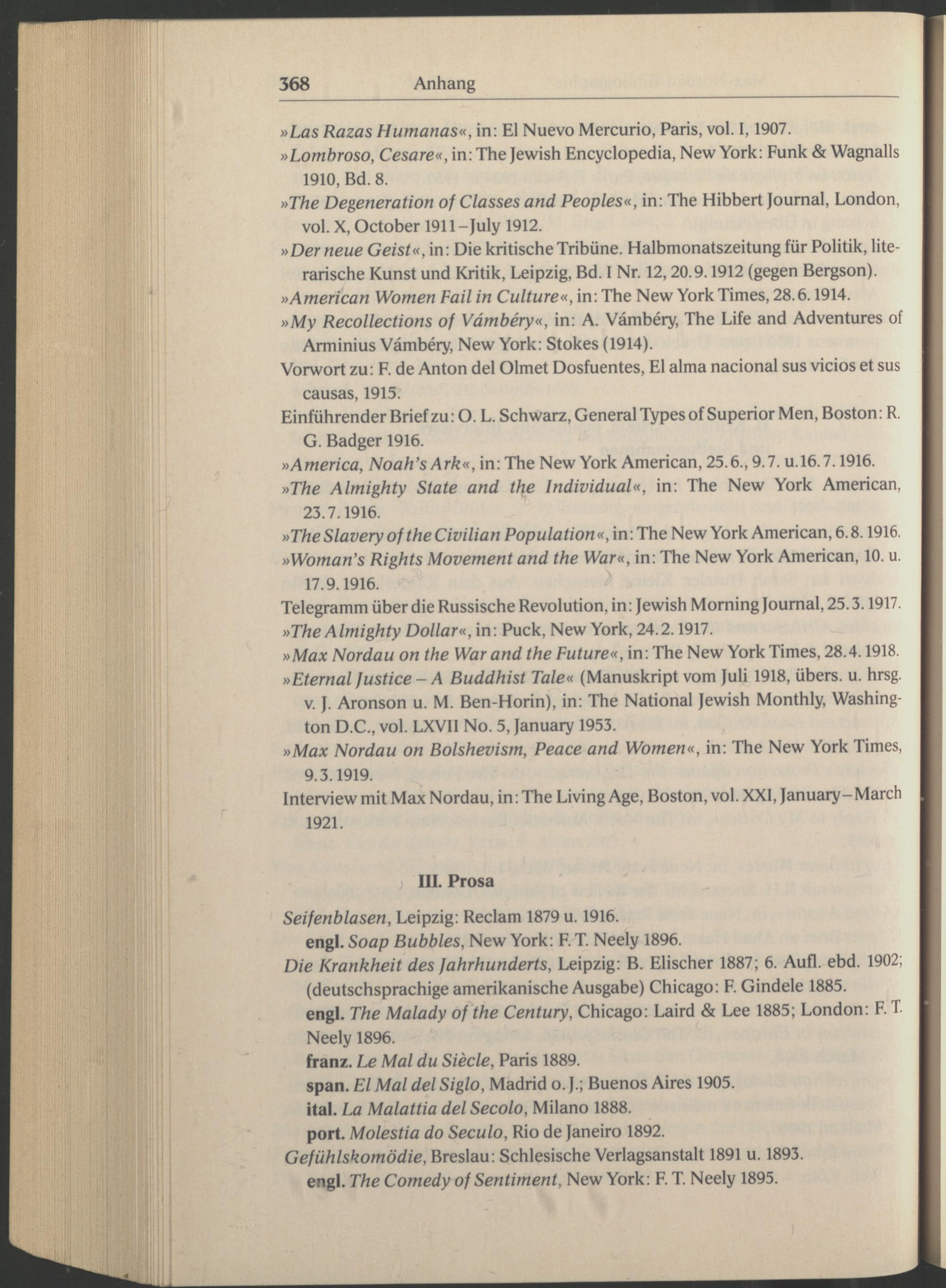 »Max Nordau on the War and the Future«, in: The New York Times , 28.4.1918. »Etemal fustice-A Buddhist Tale« (Manuskript vom Juli 1918, übers, u. hrsg. v. J. Aronson u. M. Ben-Horin), in: The National Jewish Monthly, Washing ton D.C., vol. LXV1I No. 5, January 1953.
